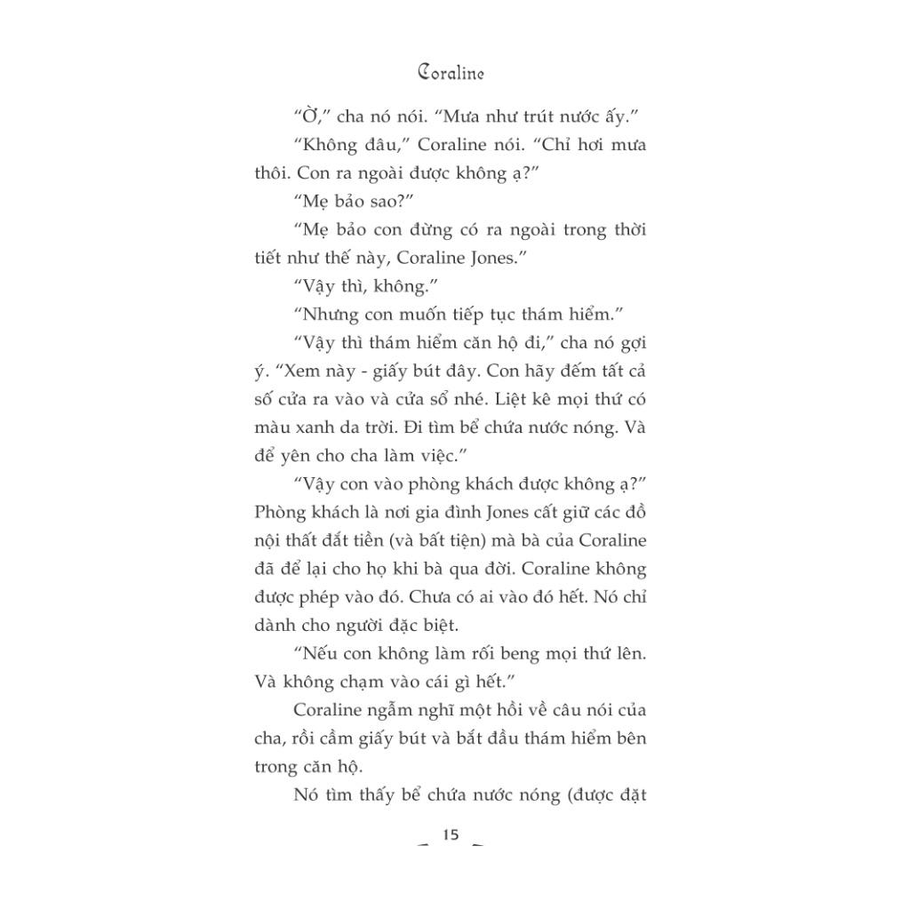 Tác giả: Neil GaimanDịch giả: Linh VũNhà xuất bản: Hội nhà vănSố trang: 218Ngày phát hành: 10-2023Khi Coraline bước qua cánh cửa, nó nhìn thấy một ngôi nhà giống hệt nhà mình. Chỉ có điều, mọi thứ dư...