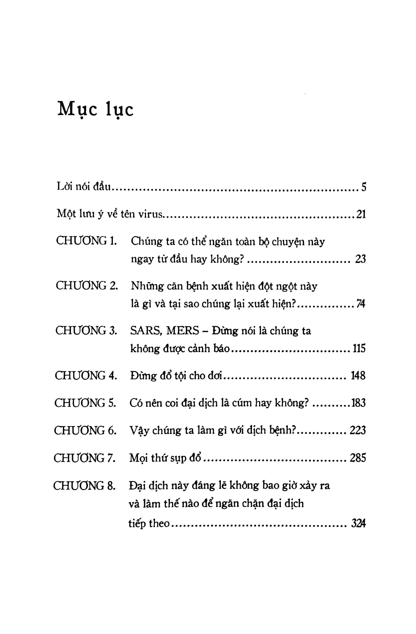 Cuốn sách mang đến cho bạn đọc một lịch sử ngắn gọn nhưng đầy kịch tính về những đợt bùng phát bệnh dịch gần đây, từ SARS, MERS, H1N1, Zika đến Ebola. Song song với nó là các kiến thức căn bản về dịch tễ học, virus là gì, nó lây lan bằng cách nào, các nhà khoa học giải trình tự gene và tìm ra vaccine ra sao.