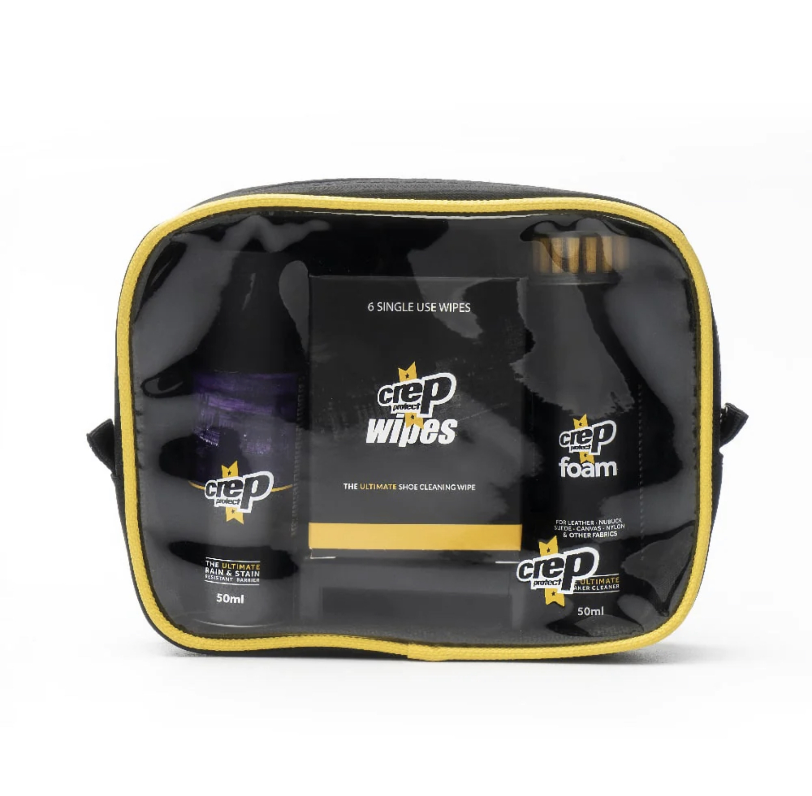 Bộ vệ sinh giày Crep Protect dành riêng cho đi du lịch Bao gồm Một bình xịt chống thấm nước nano Crep Protect Spray. Một chai xịt vệ sinh giày có đầu kết hợp bàn