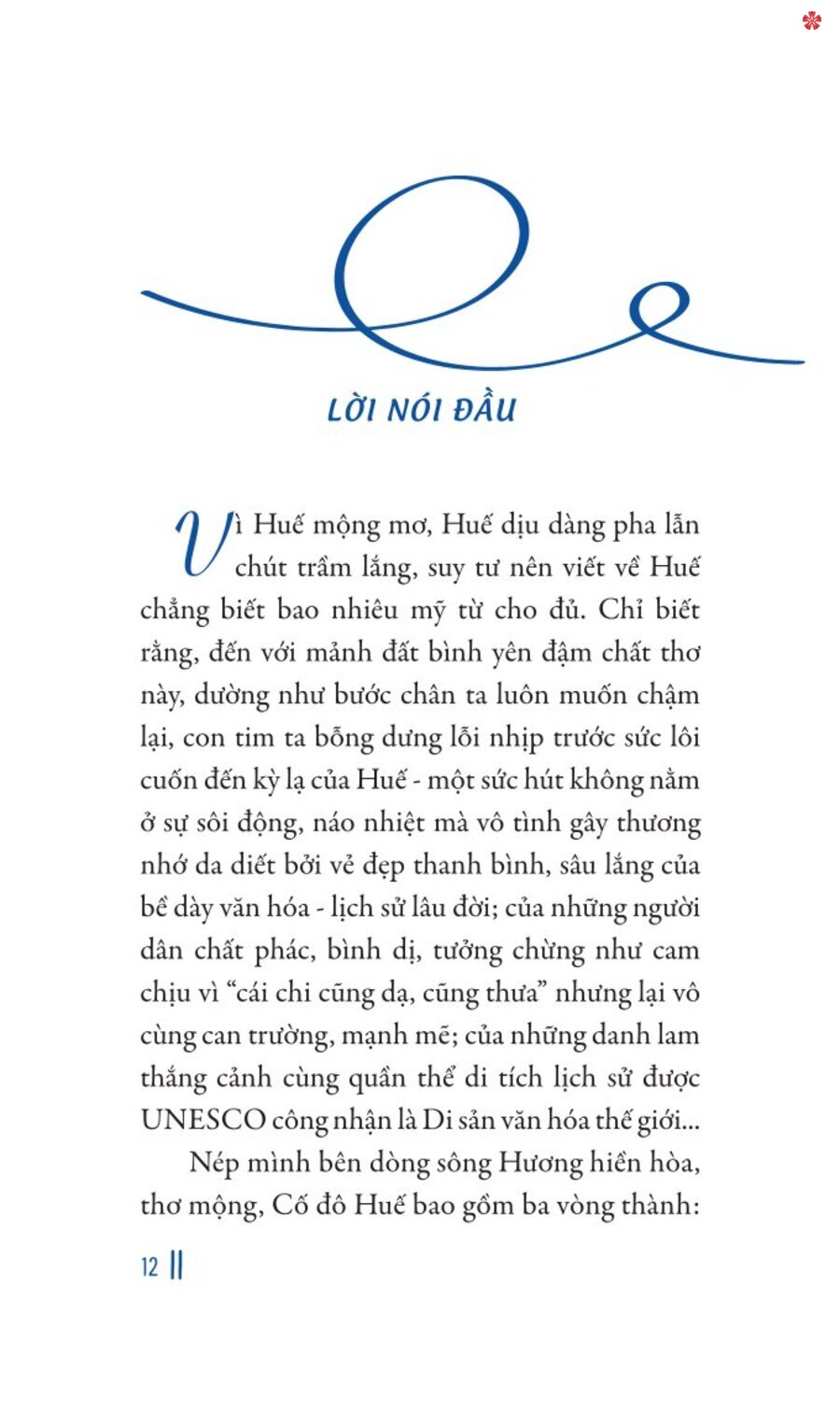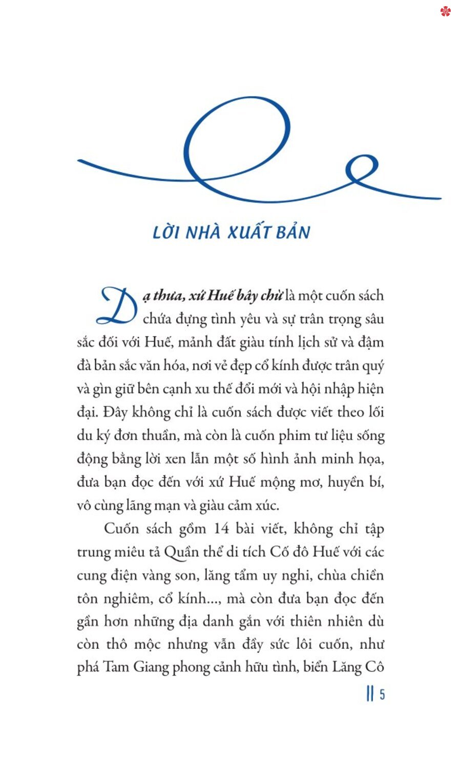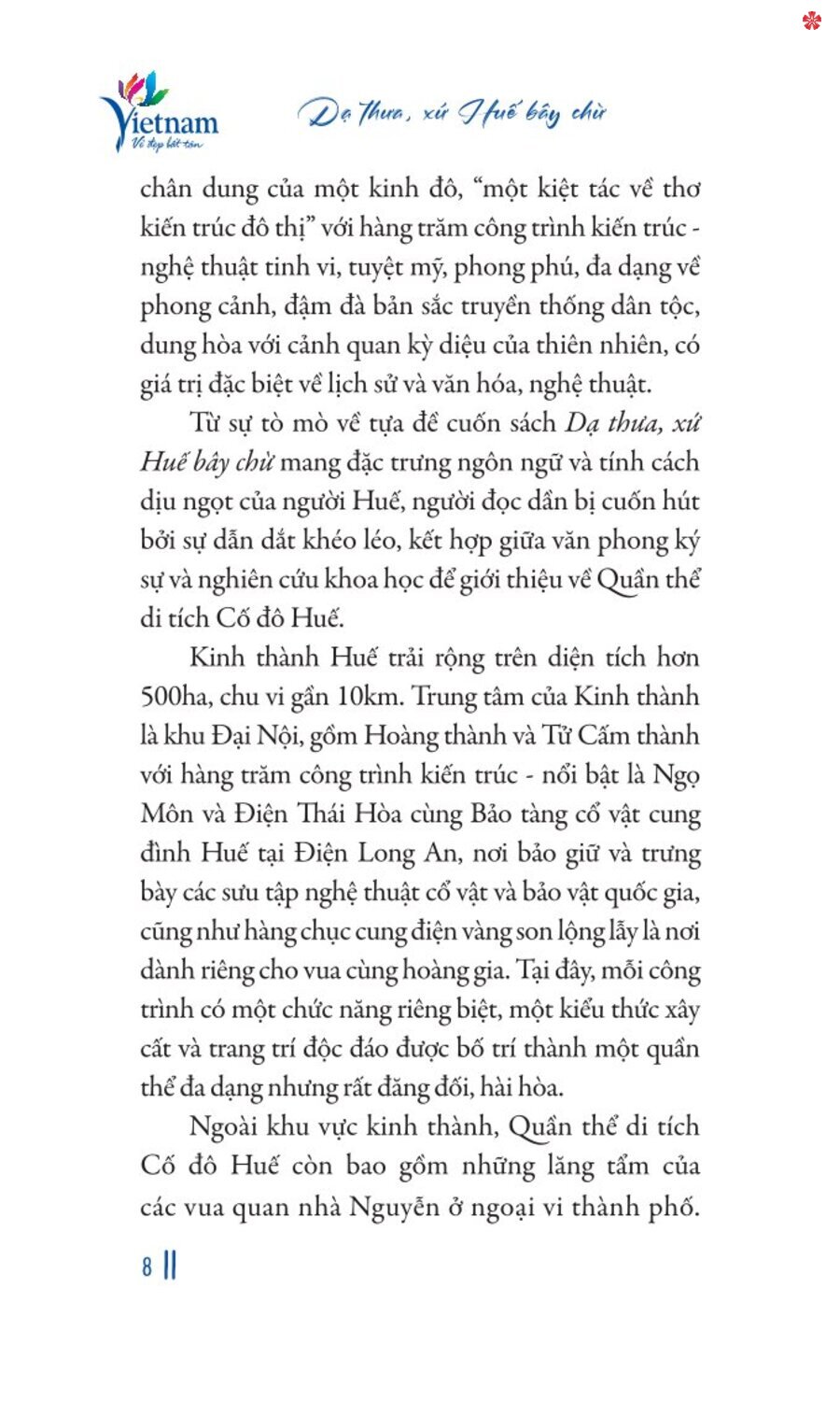 Mua tại TiktokDạ thưa, xứ Huế bây chừ là một cuốn sách chứa đựng tình yêu và sự trân trọng sâu sắc đối với Huế, mảnh đất giàu tính lịch sử và đậm đà bản sắc văn hóa, nơi vẻ đẹp cổ kính được trân quý và gìn giữ bên cạnh xu thế đổi mới và hội nhập hiện đại. Đây không chỉ là cuốn sách được viết theo lối du ký đơn thuần, mà còn là cuốn phim tư liệu sống động bằng lời xen lẫn một số hình ảnh minh họa, đưa bạn đọc đến với xứ Huế mộng mơ, huyền bí, vô cùng lãng mạn và giàu cảm xúc.