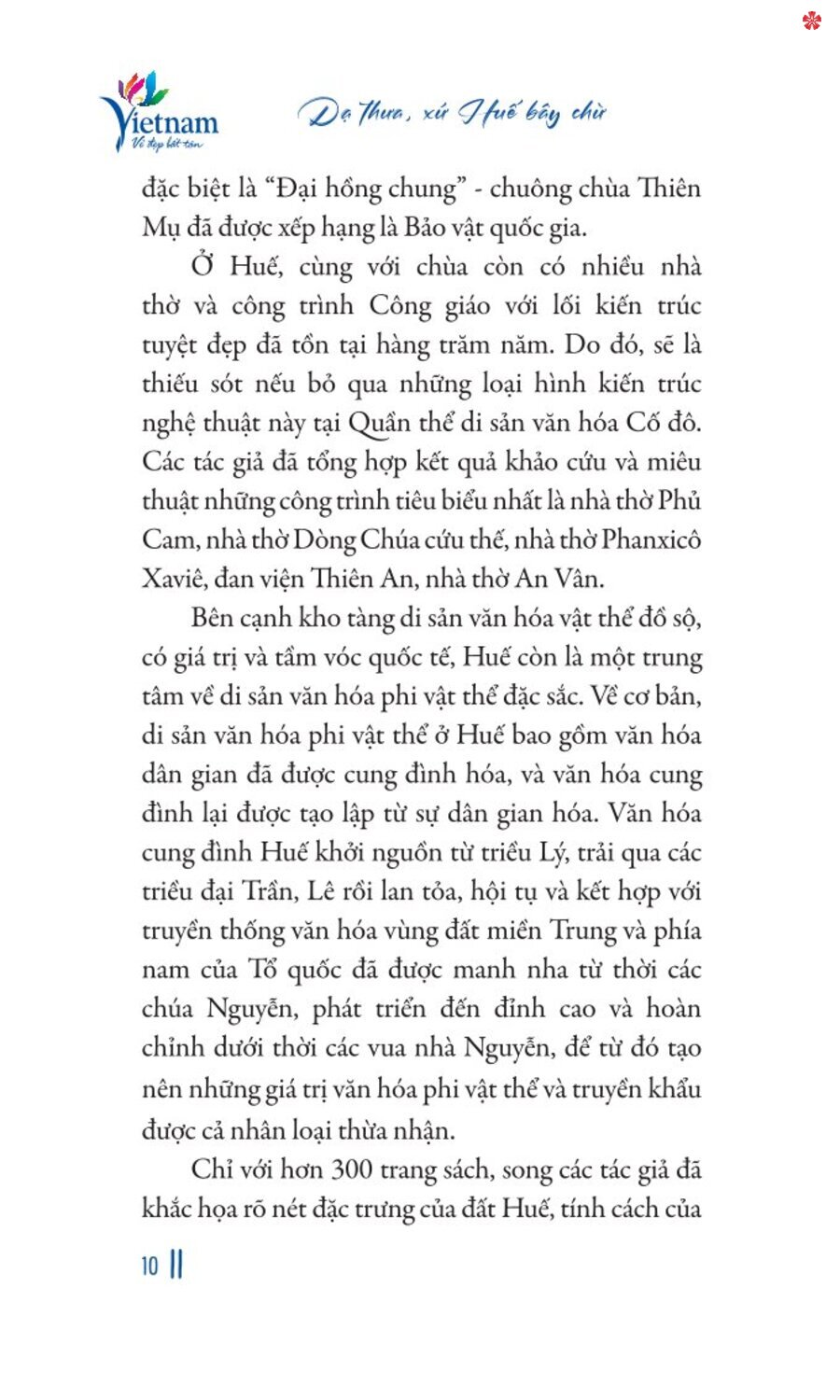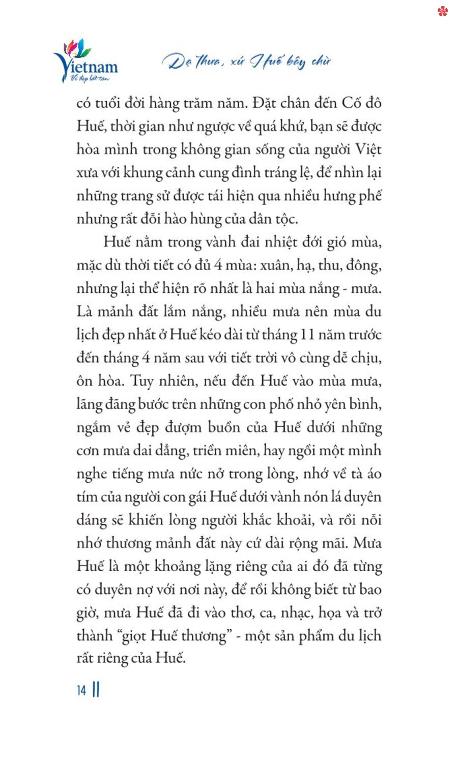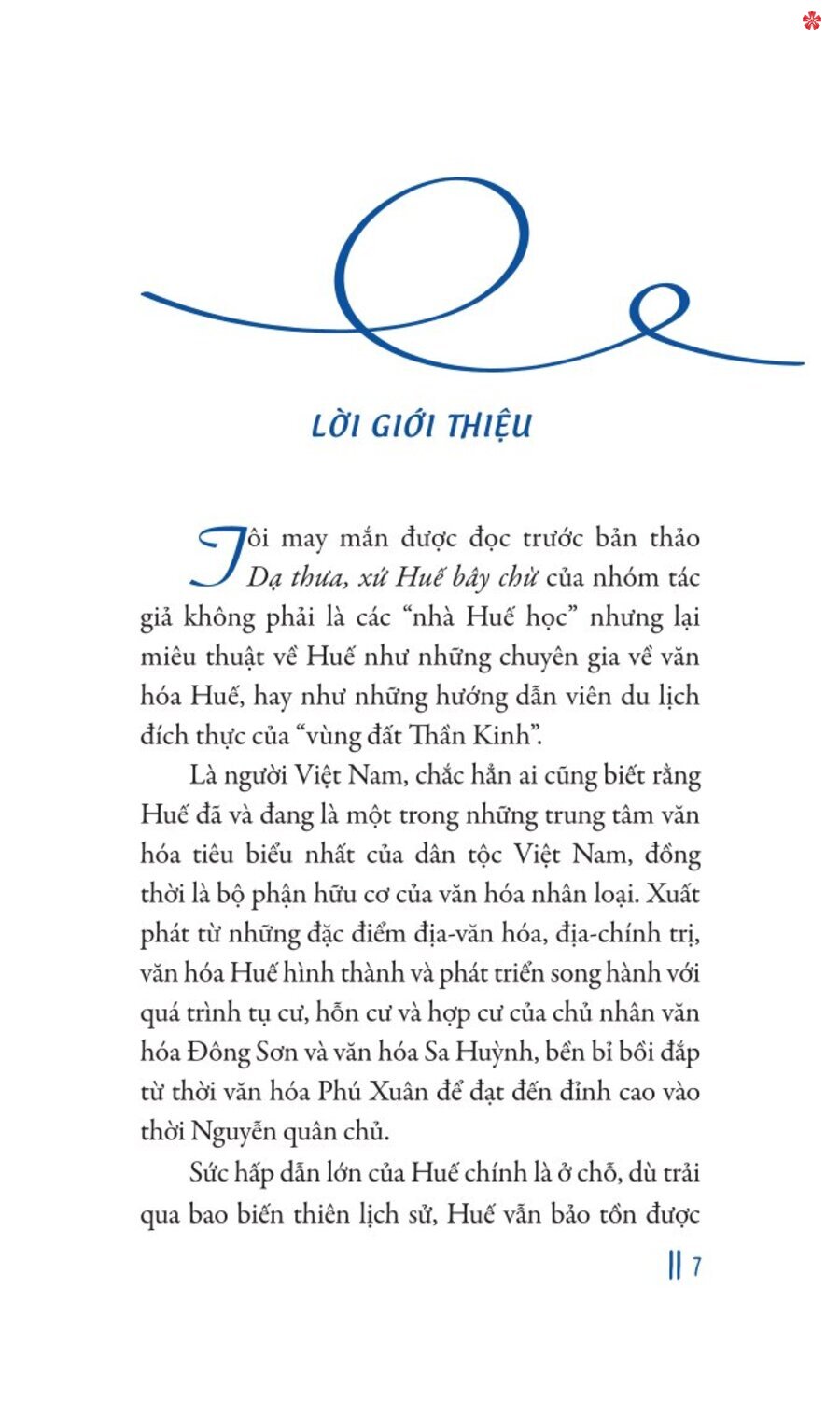 Mua tại TiktokDạ thưa, xứ Huế bây chừ là một cuốn sách chứa đựng tình yêu và sự trân trọng sâu sắc đối với Huế, mảnh đất giàu tính lịch sử và đậm đà bản sắc văn hóa, nơi vẻ đẹp cổ kính được trân quý và gìn giữ bên cạnh xu thế đổi mới và hội nhập hiện đại. Đây không chỉ là cuốn sách được viết theo lối du ký đơn thuần, mà còn là cuốn phim tư liệu sống động bằng lời xen lẫn một số hình ảnh minh họa, đưa bạn đọc đến với xứ Huế mộng mơ, huyền bí, vô cùng lãng mạn và giàu cảm xúc.