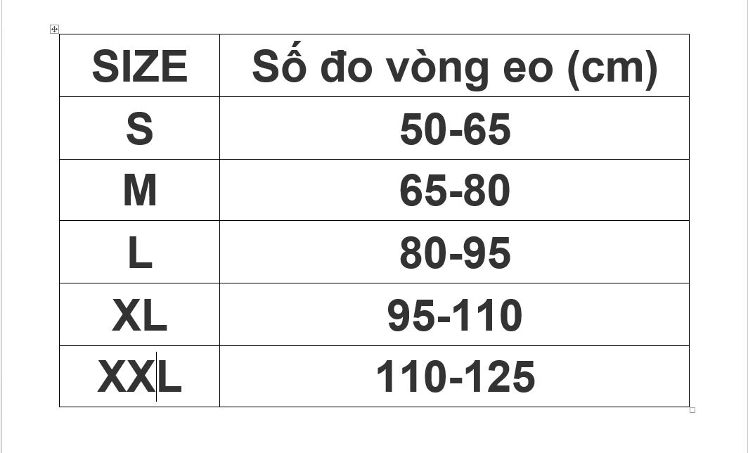 Quý khách vui lòng chọn size theo vòng bụng Size S: 50 - 65 cm Size M: 65 - 80 cm Size L: 80 - 95 cm Size XL: 95 - 110 cm Size XXL: