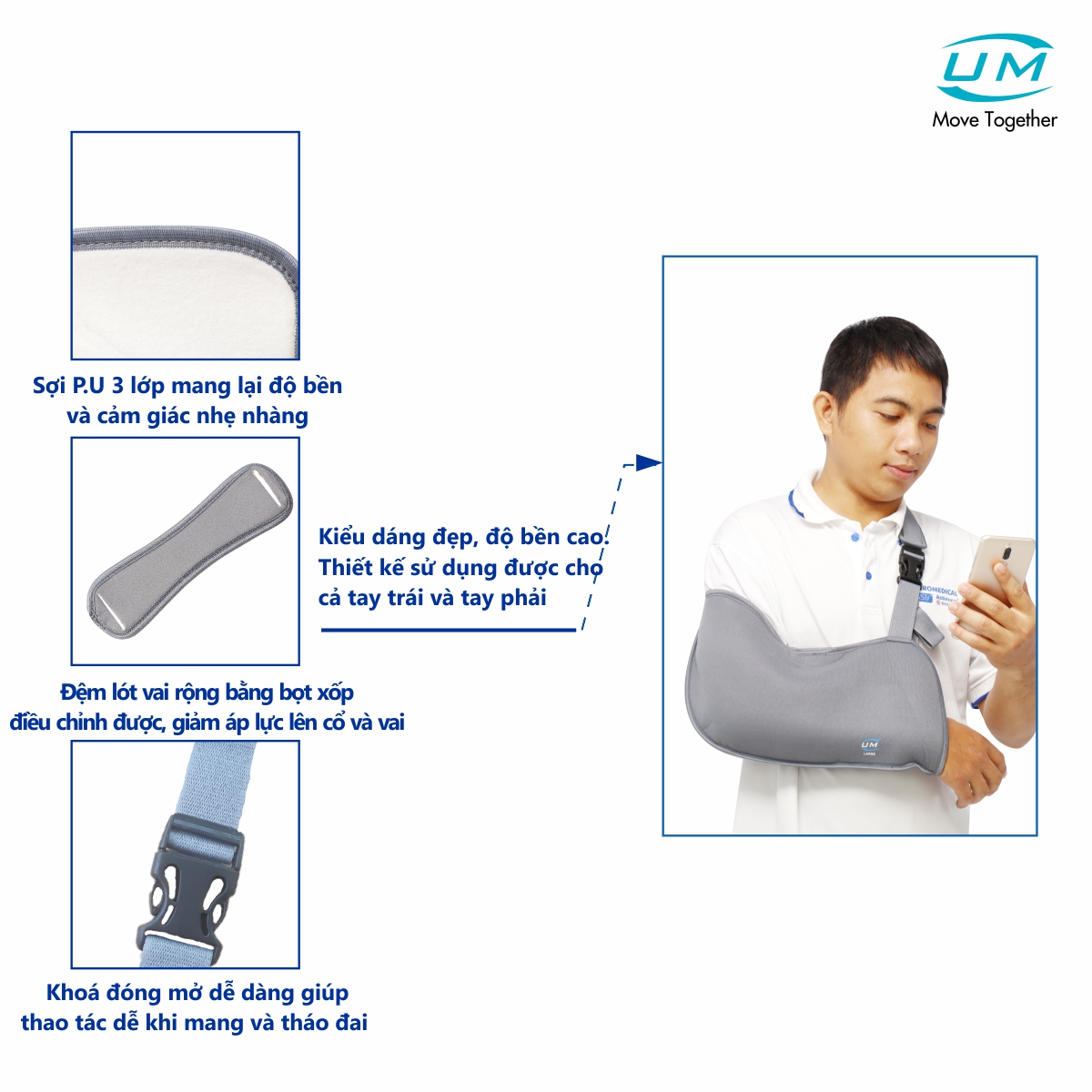 Đai treo tay dạng túi cao UM (C08) được thiết kế bao phủ toàn hoàn phần cánh tay, giúp bảo vệ tốt được toàn bộ phần cánh tay bị thương CHỈ ĐỊNH Giữ, hỗ trợ và cố định cánh tay bị bong gân, gãy hoặc sau phẫu thuật. ĐẶC TÍNH VÀ HỖ TRỢ