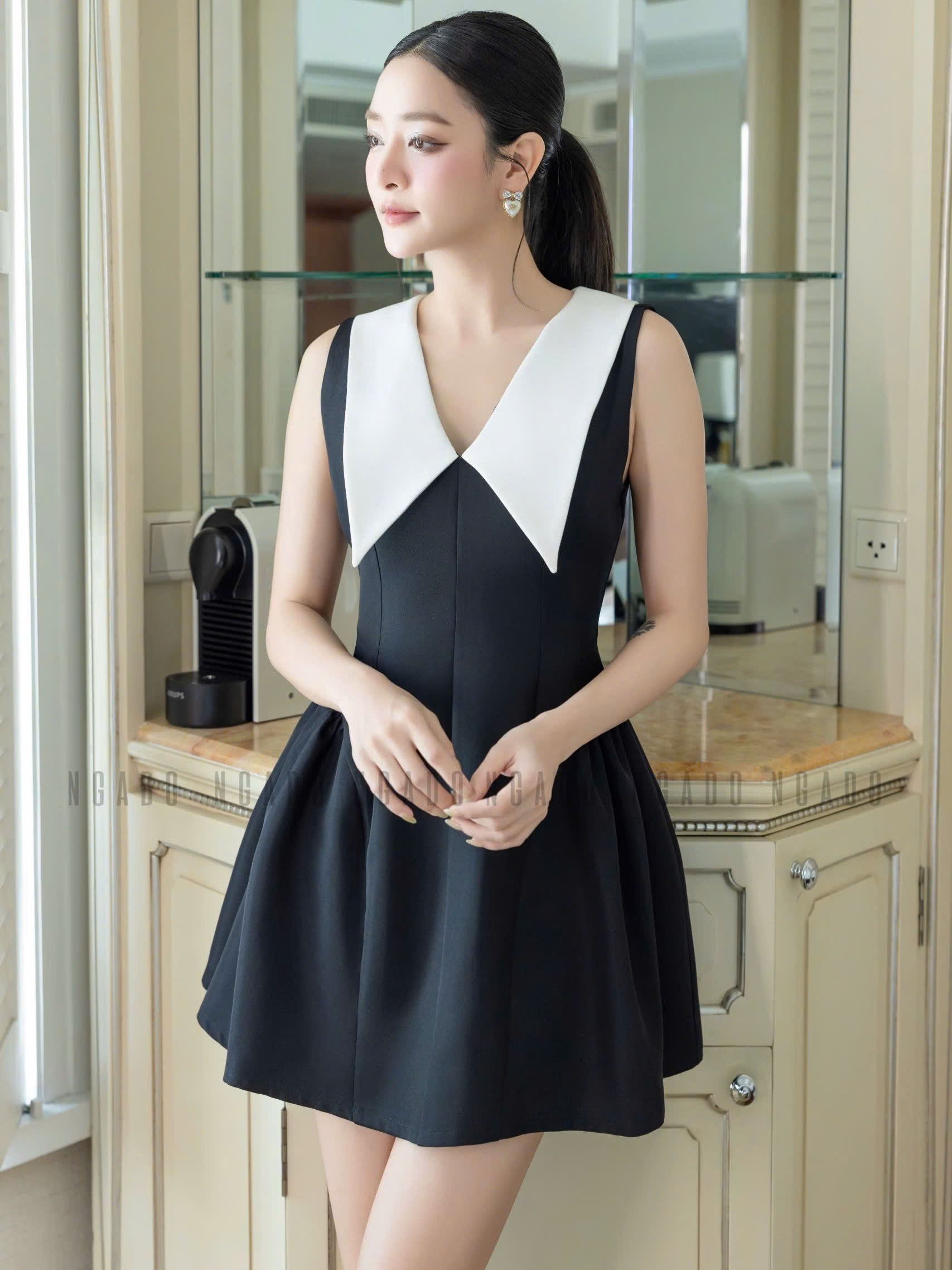 ✨Đầm đen sát nách phối cổ trắng NGADO , đầm nữ , đầm dự tiệc