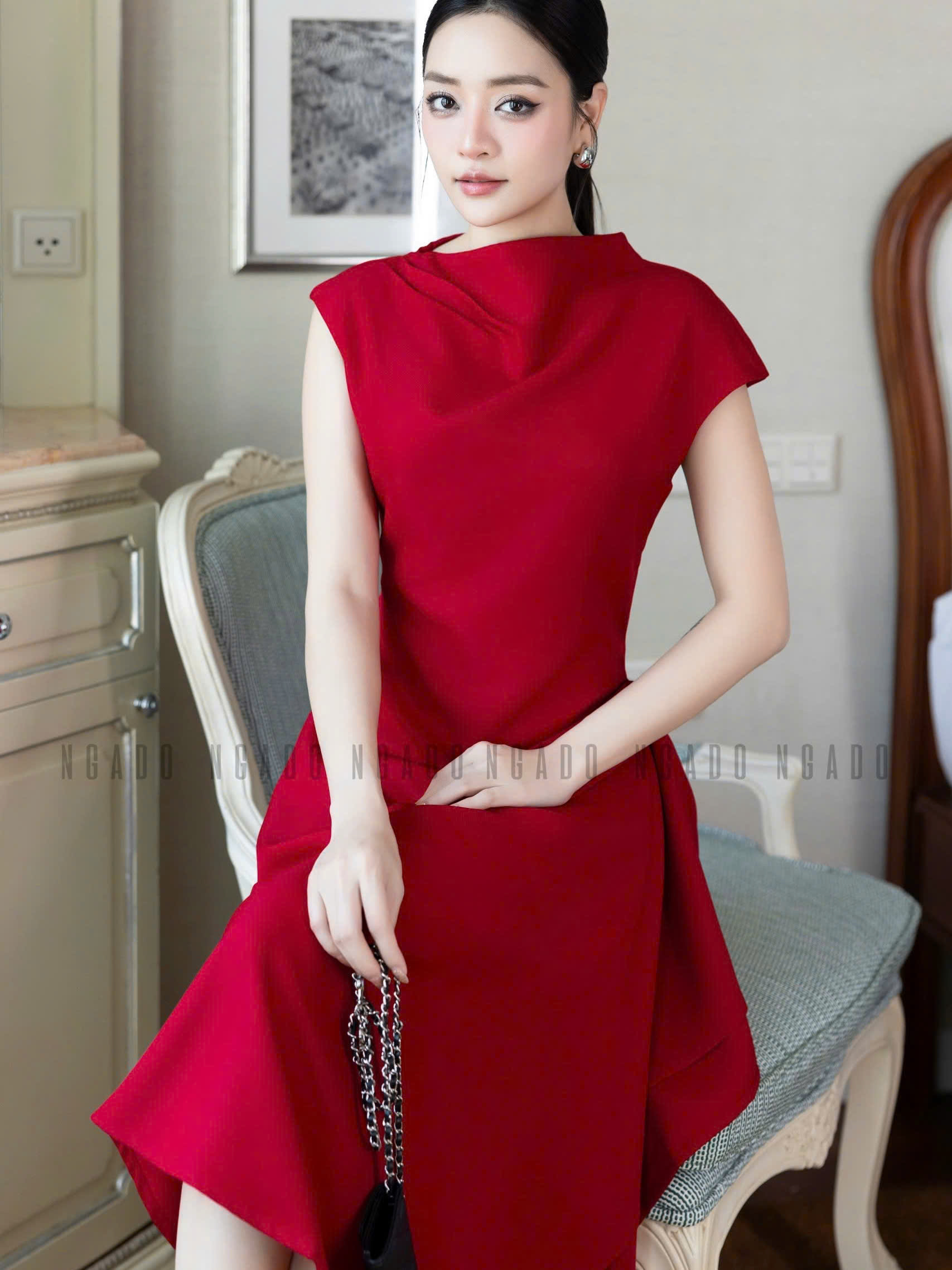 ✨Đầm đỏ cổ cao vạt xéo NGADO