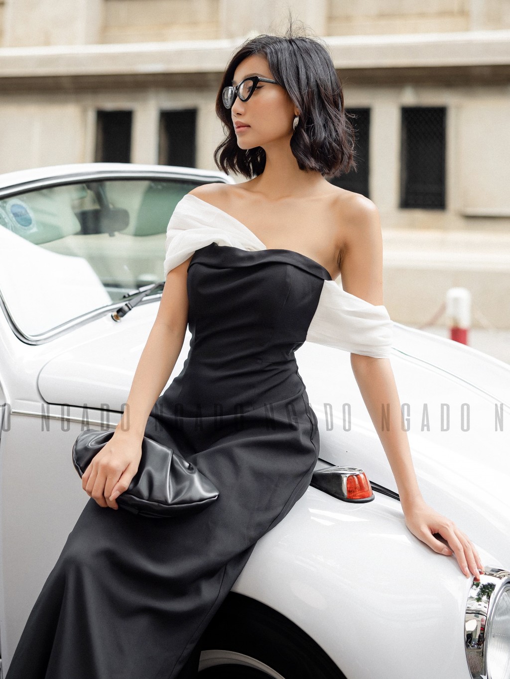 ✨Đầm đuôi cá đen phối trắng NGADO , đầm nữ , Đầm dự tiệc sang chảnh , Đầm đuôi cá hở vai