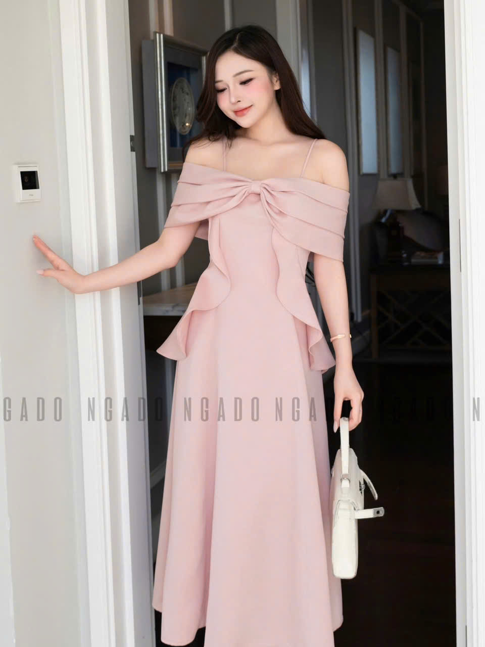 ✨Đầm hồng 2 dây trễ vai NGADO , đầm dài , đầm dự tiệc