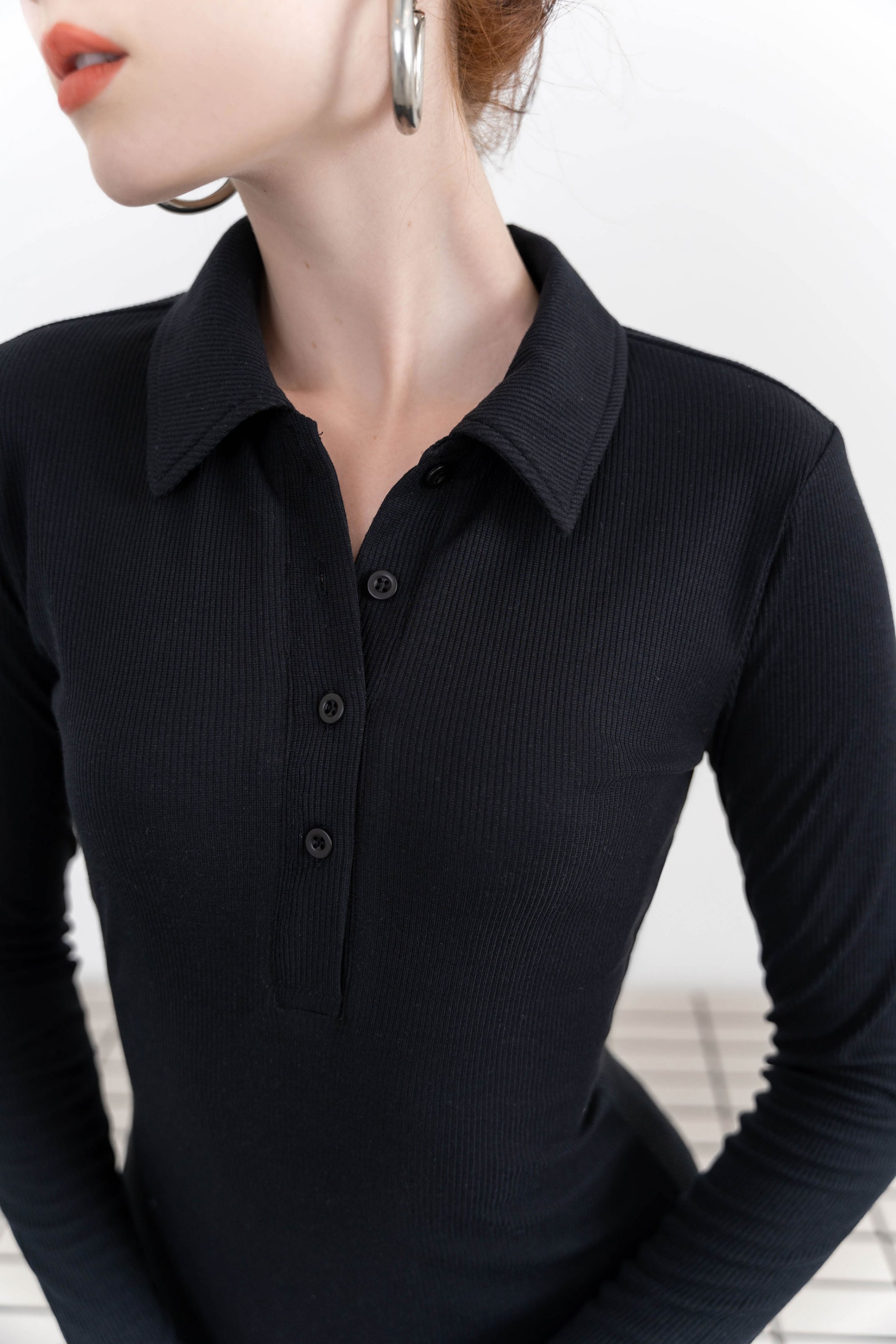 Mua tại TiktokCHẤT LIỆU BO GÂN SỚ NHỎ DÀY MỀM ĐẦM MÀU ĐEN, CỔ POLO NÚT GÀI FORM ÔM XÒE, TAY DÀI ĐẦM DÀI QUA GỐI ĐIỂM NHẤN LÀ CHIẾC NẸP ÁO DÀI VÀ TAG LOGO LAAS GẮN Ở LAI VÁY