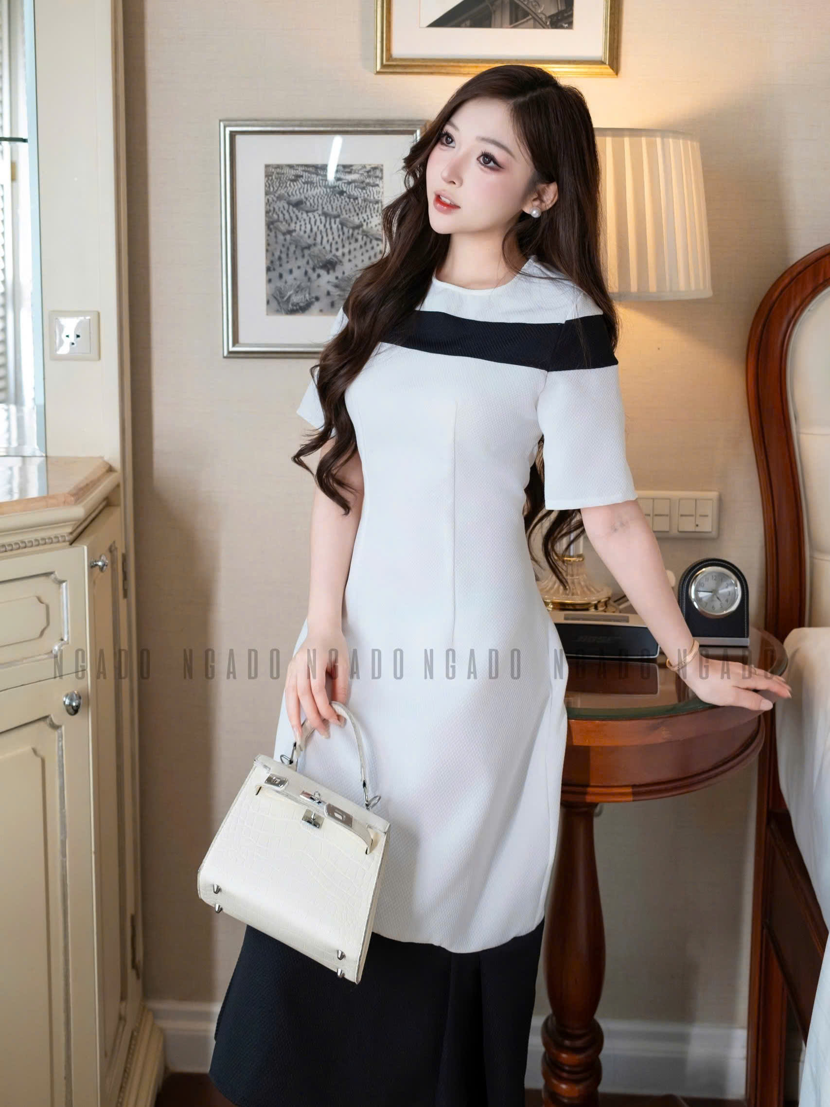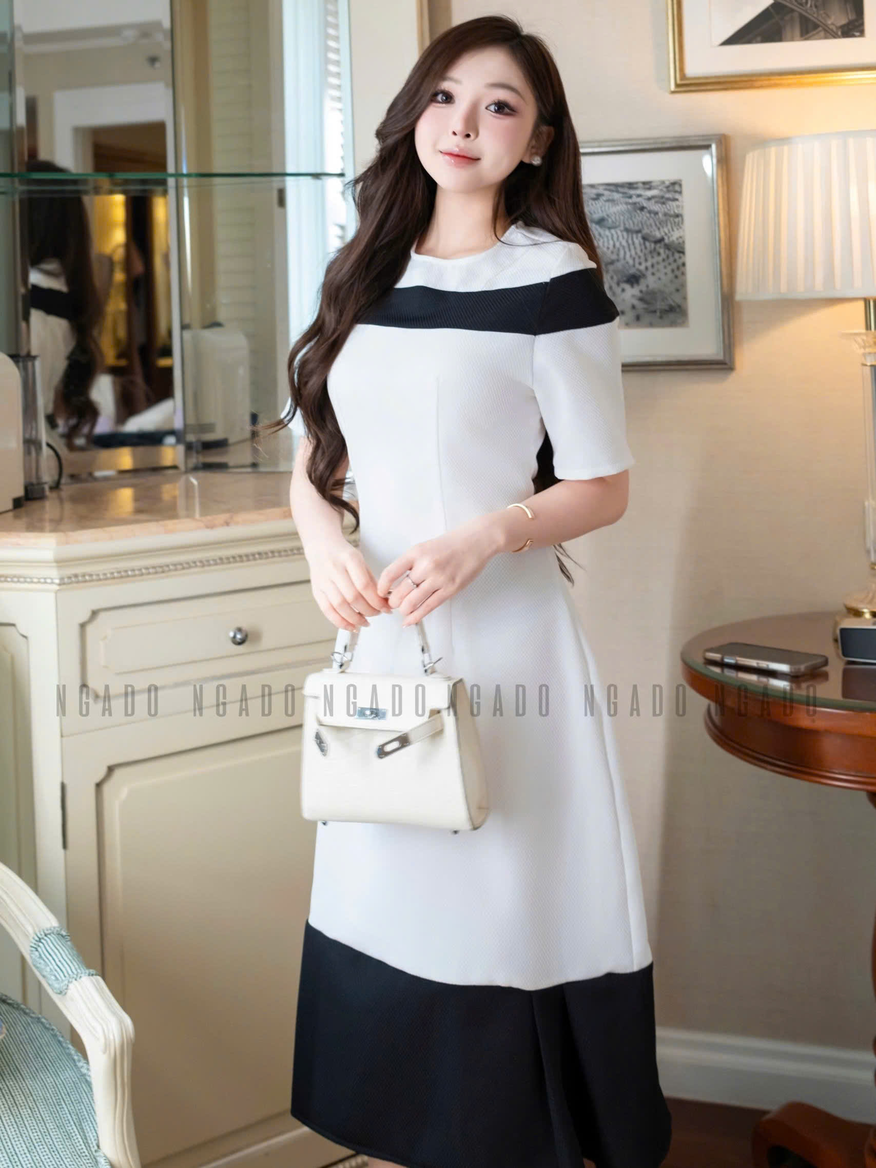 Đầm tiểu thư cổ nơ phối đen trắng ngọt ngào thanh lịch dáng ngắn dài