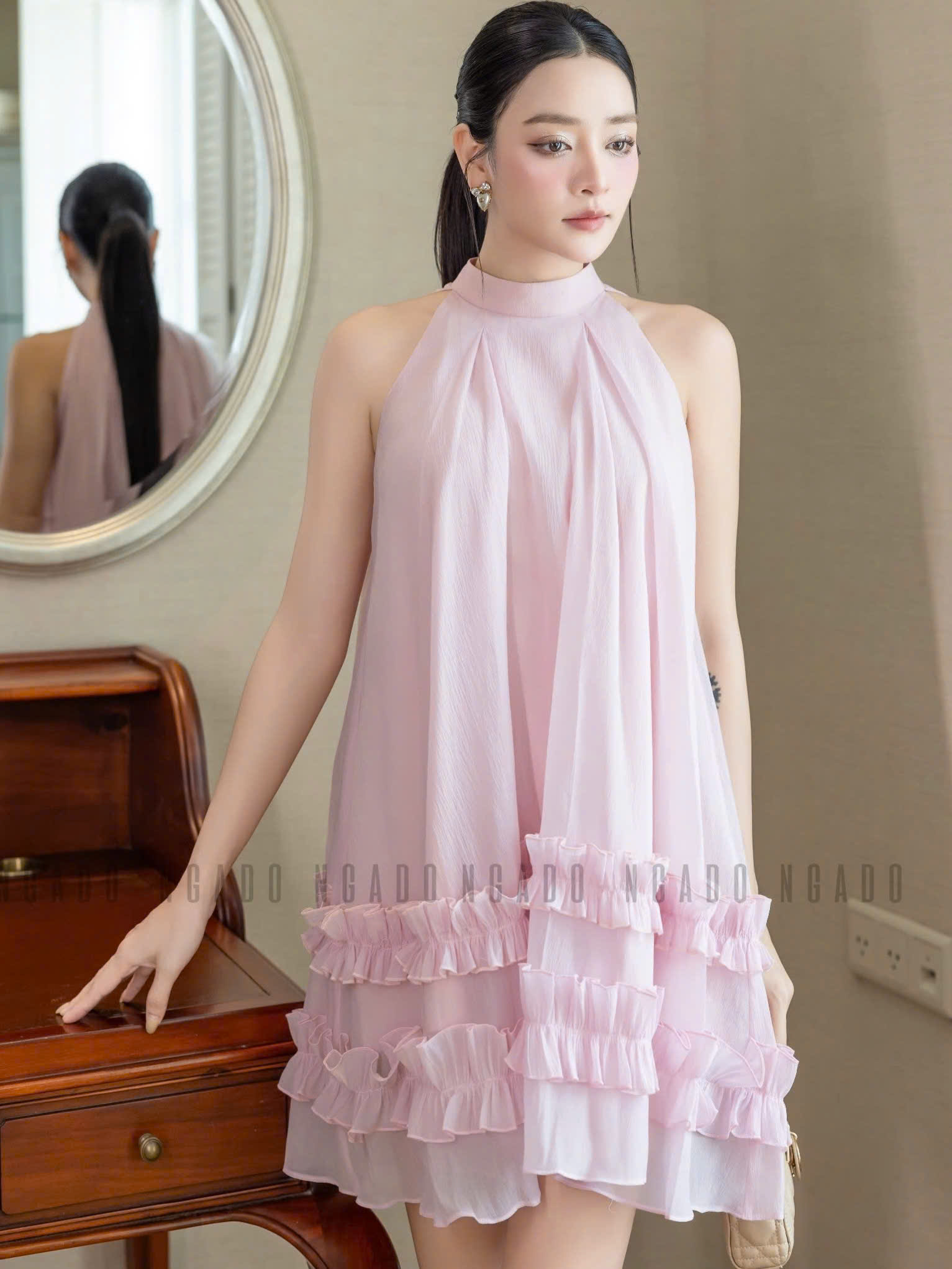 Tên sản phẩm: Đầm yếm hồng phối bèo