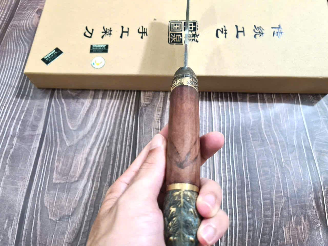 Chất liệu tay cầm: gỗ CẨM LAI, khâu và chuôi cuối dao bằng đồng thau