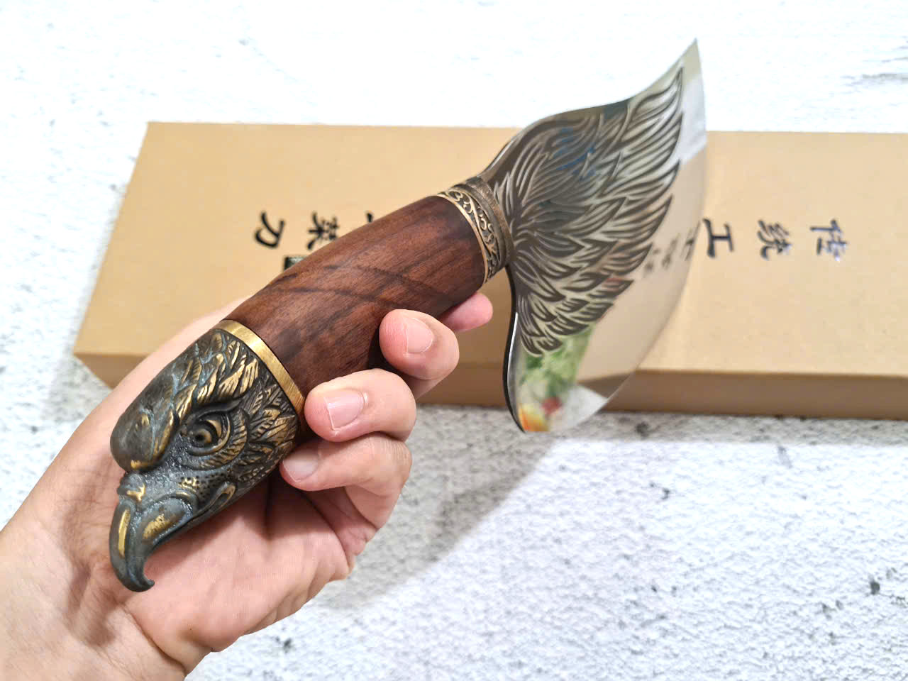 - Chức năng: Chặt xương ống, chân giò, trâu bò - Kích thước: Lưỡi: 22cm, cán: 10cm, rộng: 10cm, dầy: 5ly, trọng lượng: 800g - Cán : Gỗ mun, Khâu đồng đỏ , chốt đinh