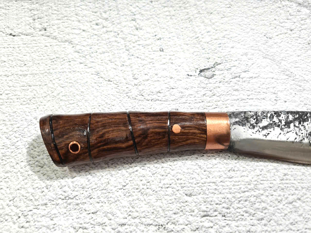 Cán gỗ cẩm chỉ núi đá kết hợp với khâu đồng đỏ được chốt đinh tán và keo liên kết đảm bảo độ bền chắc.