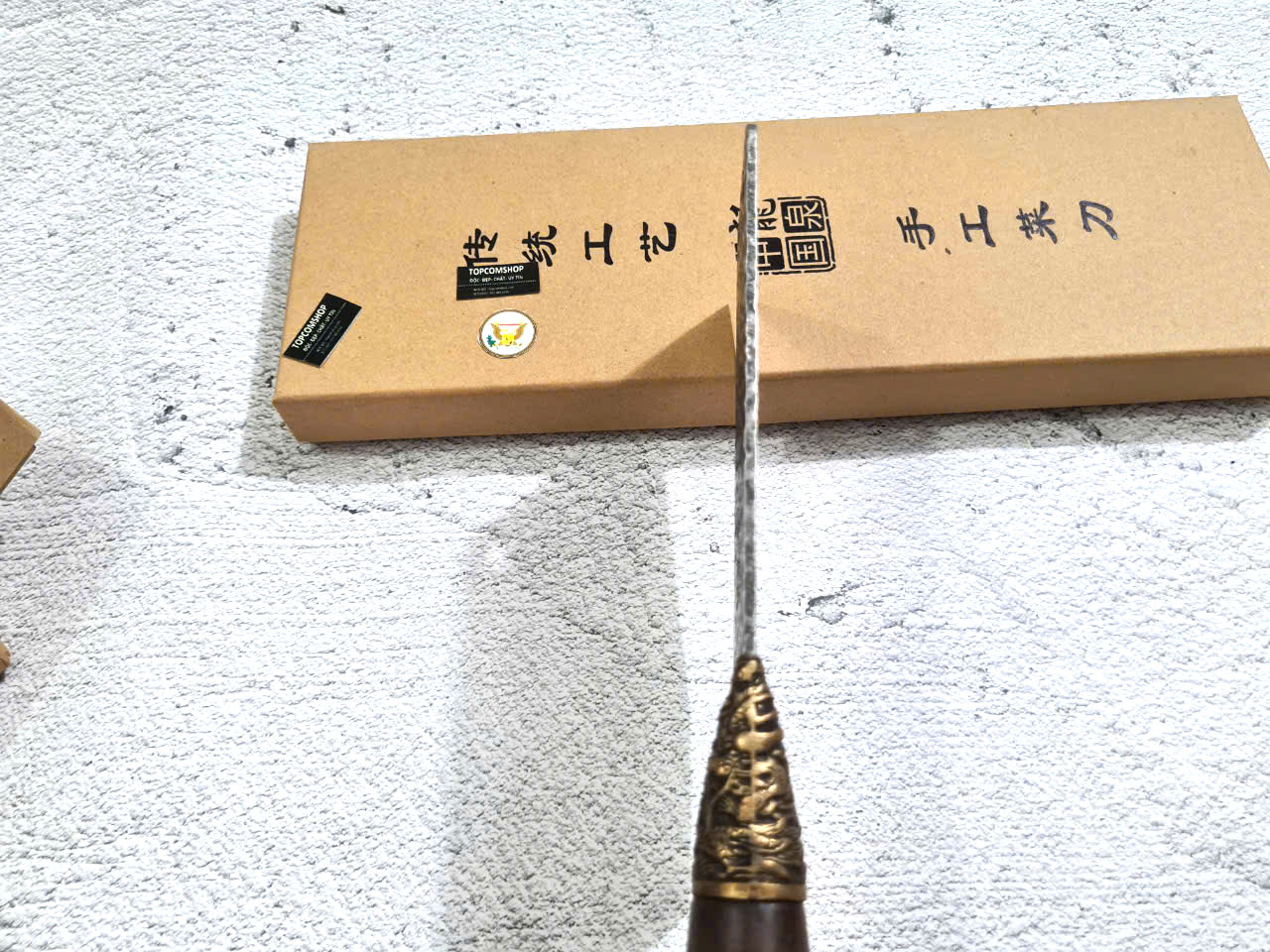 Chất liệu tay cầm: gỗ CÁNH GÀ, khâu và chuôi cuối dao bằng đồng thau