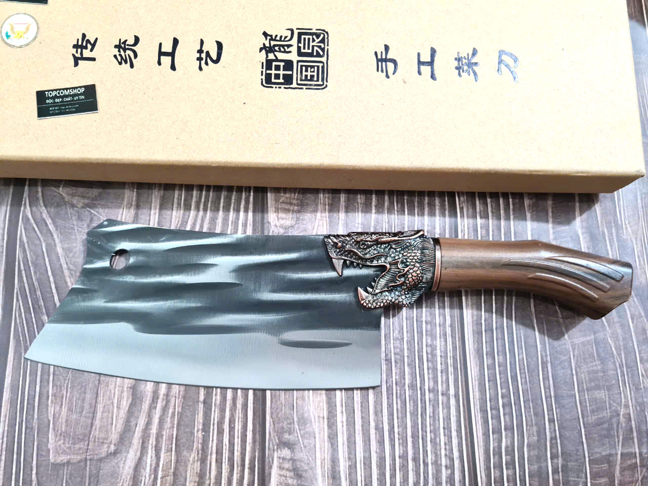 - Chức năng: Chặt xương ống, chân giò, trâu bò - Kích thước: Lưỡi: 22cm, cán: 10cm, rộng: 10cm, dầy: 5ly, trọng lượng: 800g - Cán : Gỗ mun, Khâu đồng đỏ , chốt đinh