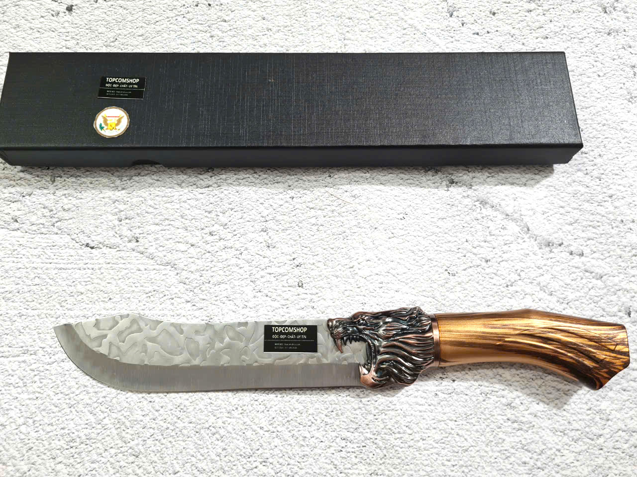 D SỐ 4 : TỔNG DÀI : 32cm, LƯỠI: 18cm,RỘNG : 4.5cm, dày: 3mm, NẶNG : 2.3 lạng, CHẤT liệu lưỡi: 4Cr13MOV (thép 4 crom 13 molypden vanadi).Chất liệu CÁN: nhựa abs xịn . khâu đầu rồng và chuôi bằng thép 4cr13