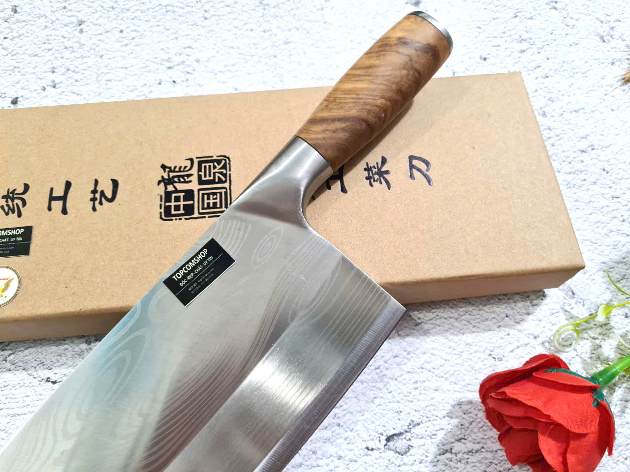 Dao Phúc Sen - Dao Chặt Gà Cán Ốp Nu Nghiến G05OCD - Kích thước: lưỡi: 23cm, cán: 13cm, rộng: 8,5cm-9cm, dầy: 0,3, trọng lượng: 500g - 600g - Chức năng: sử dụng chuyên chặt