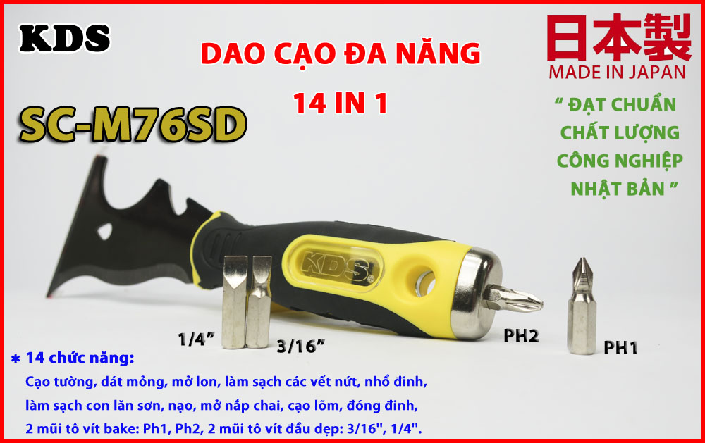 GIỚI THIỆU DAO CẠO GIOĂNG 14 TRONG 1 KDS SC-M76SD: Dao cạo sơn đa năng KDS SC-M76SD là dụng cụ cần thiết mà mỗi thợ sơn đều nên sở hữu một cái trong quá trình làm việc, giúp đánh bay tất cả các loại sơn bị bám dính trên bề mặt một cách dễ dàng và tốn ít công sức, với thiết kế nhỏ gọn giúp cho việc mang đi và sử dụng linh hoạt trong mọi tình huống.