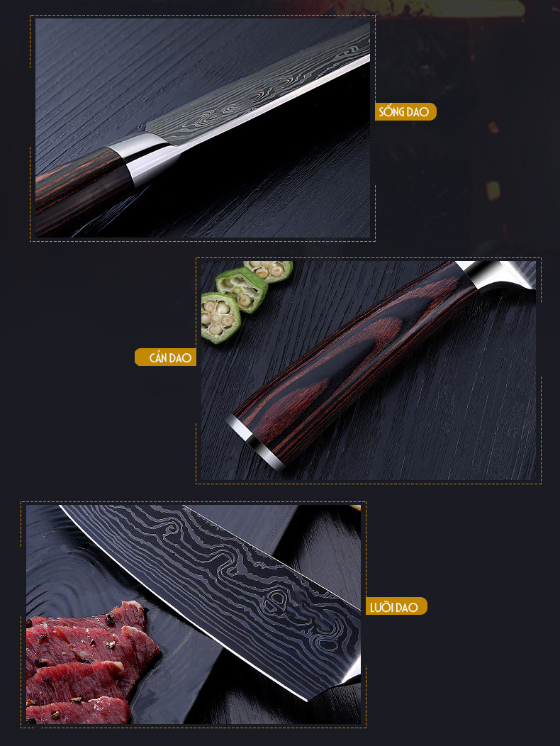 🔹 Cán dao gỗ Pakka + đinh tán chắc chắn – Tay cầm chống trơn trượt, cầm nắm thoải mái.