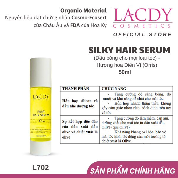 Mua tại TiktokSILKY HAIR SERUM (Dầu bóng cho mọi loại tóc) - Hương hoa Diên Vĩ (Orris) Dầu bóng dành cho mọi loại tóc, đặc biệt cho tóc khô, gãy, rụng, chẻ ngọn. Với dầu olive, chiết