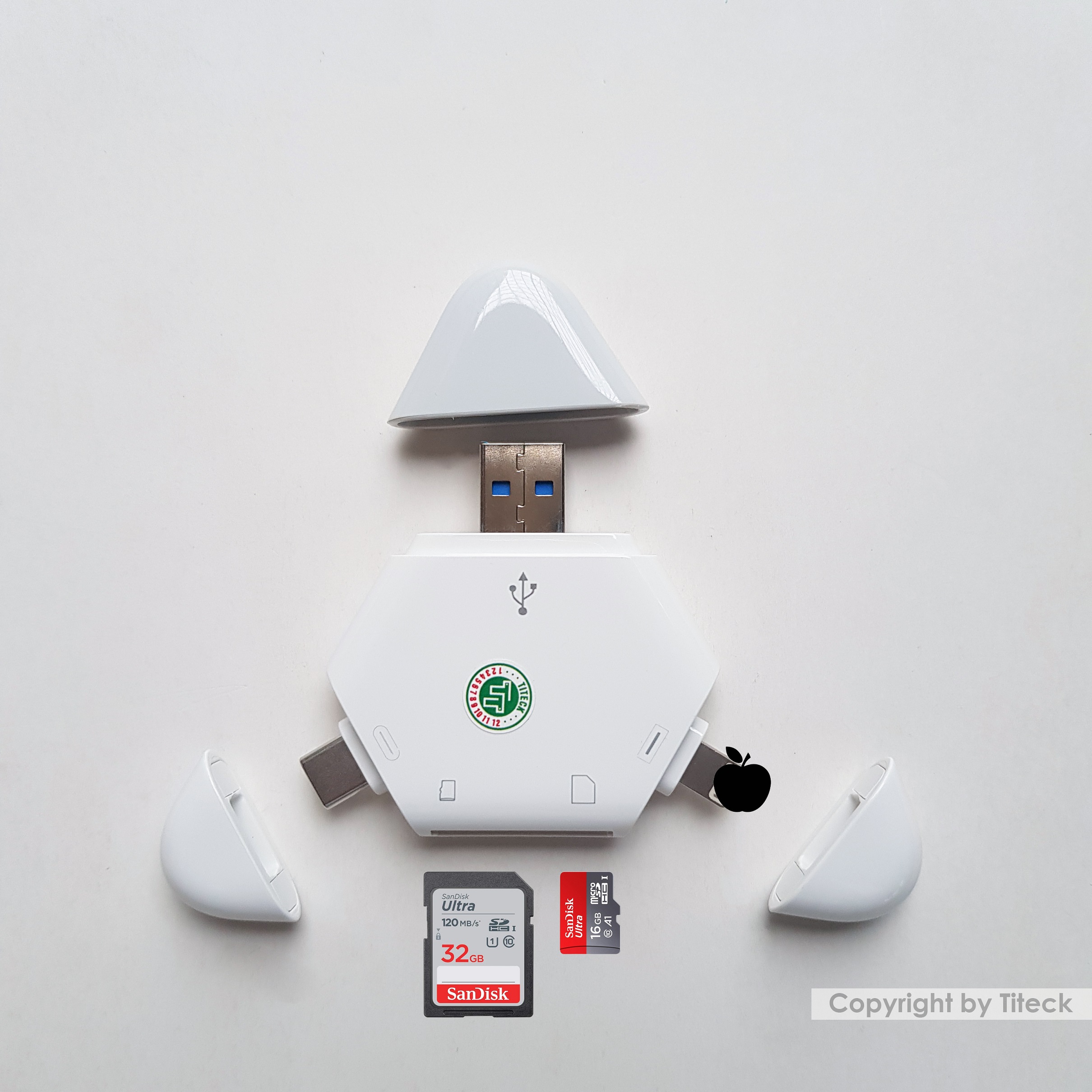 Thông số sản phẩm : Chất liệu : Nhựa ABS Kích thước : 65x65x65 mm Cổng kết nối : Type C, USB, L 8 pin Đầu đọc thẻ : SD ,