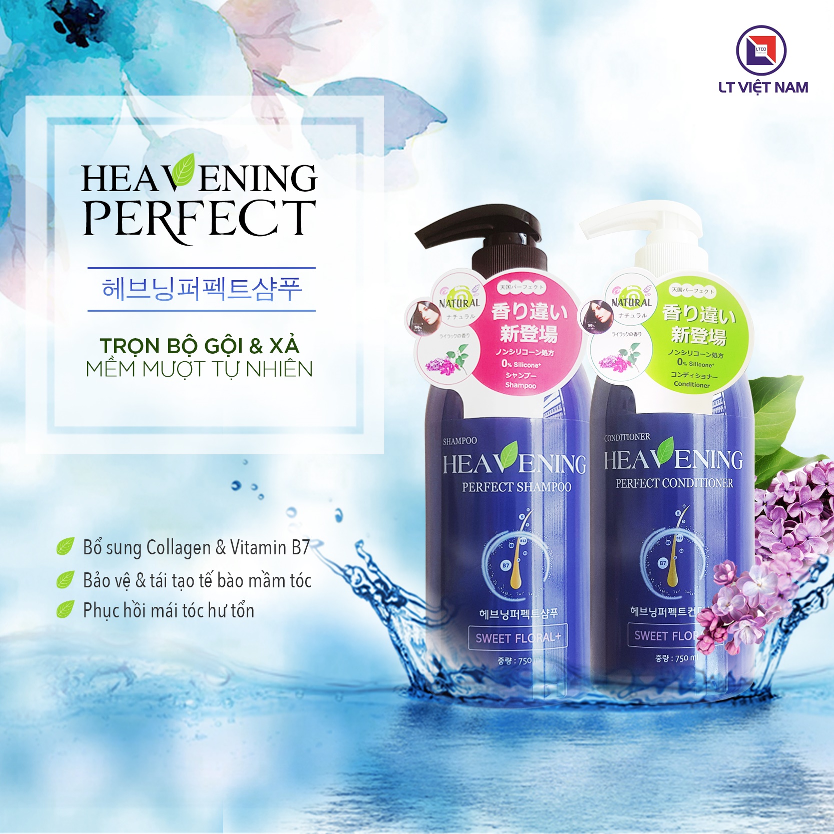 Cặp dầu gội xả dưỡng chất suôn mượt tóc Heavening Perfect (Set 01 Gội & 01 Xả x 750ml) Công dụng: Bổ sung thành phần Collagen & Vitamin B7, ngăn ngừa rụng tóc và kích thích