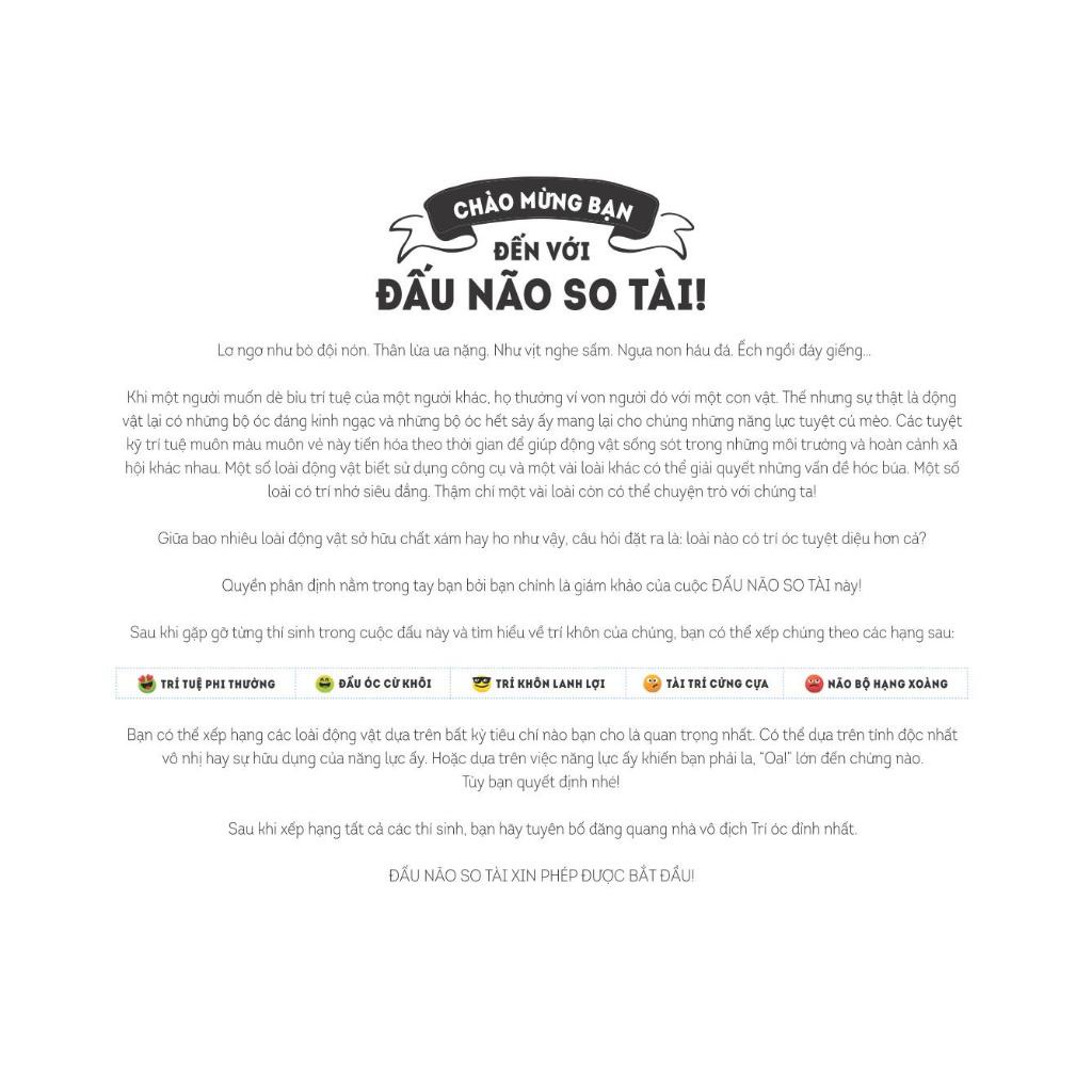 Cuốn sách "Đấu Não So Tài" sẽ đưa bạn vào một cuộc hành trình đầy thú vị để khám phá trí thông minh của các loài động vật. Qua những hình ảnh minh họa sinh động và những thông tin khoa học hấp dẫn, bạn sẽ được so sánh khả năng tư duy, ghi nhớ, giải quyết vấn đề của nhiều loài động vật khác nhau, từ những con voi có trí nhớ siêu phàm đến những chú tinh tinh thông minh.