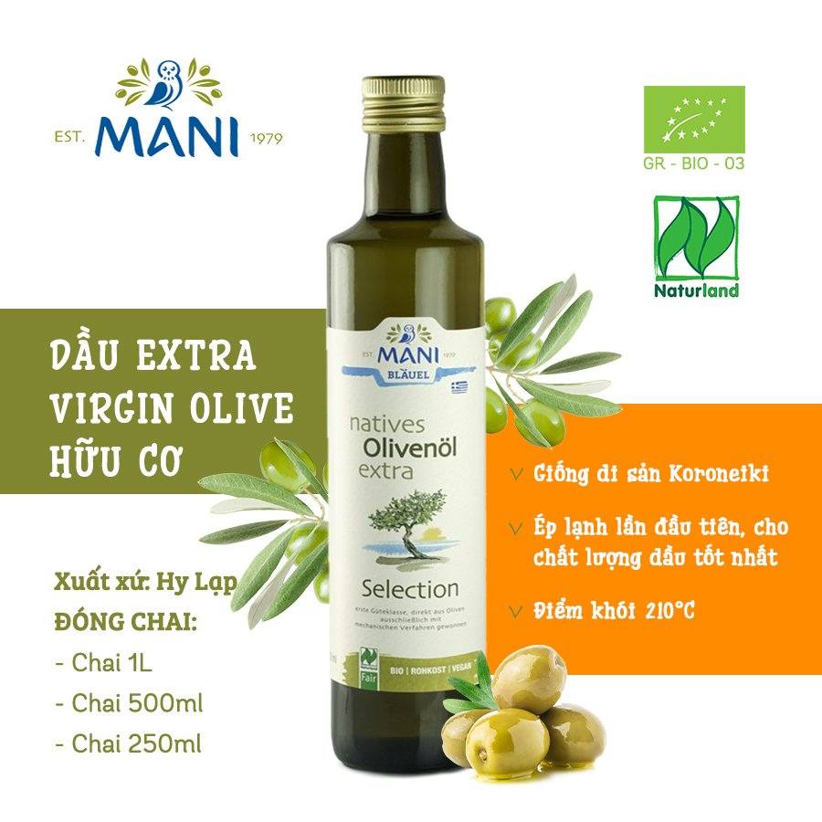 ✨Dầu Ô liu (Olive) ép lạnh nguyên chất hữu cơ chai 250ml 500ml 1L - Mani (Organic Extra Virgin Olive Oil)