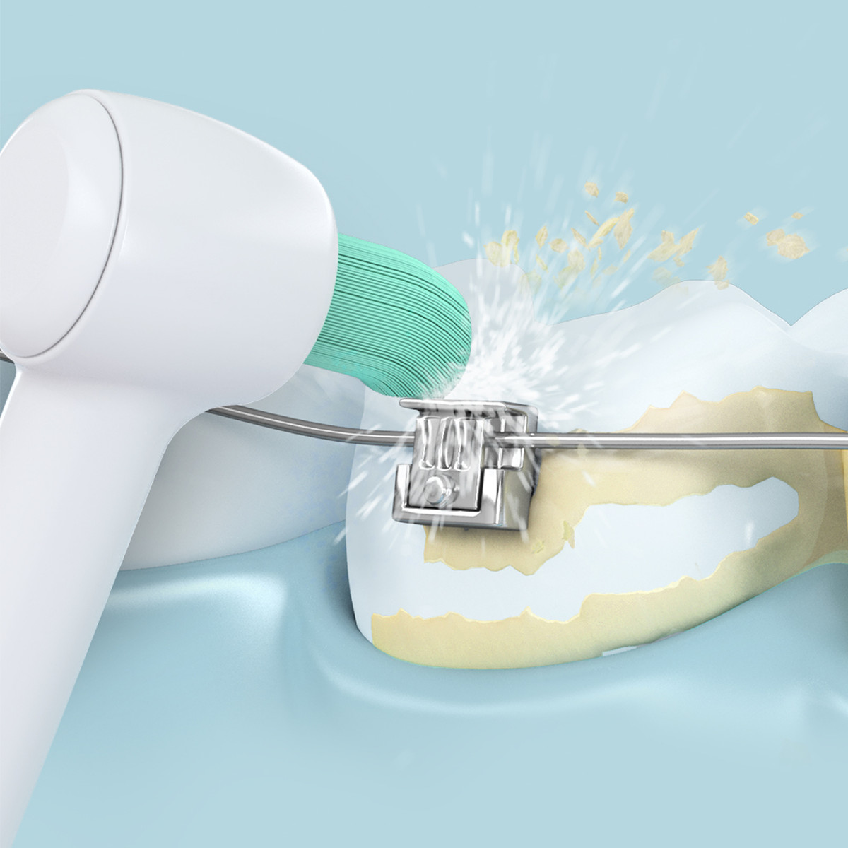 - Đầu dẫn nước bằng cao su mềm tác động nhẹ nhàng trên nướu. - Dễ dàng tháo lắp trên tay cầm - Làm sạch răng kỹ lưỡng. - Làm trôi mảng bám trên tối