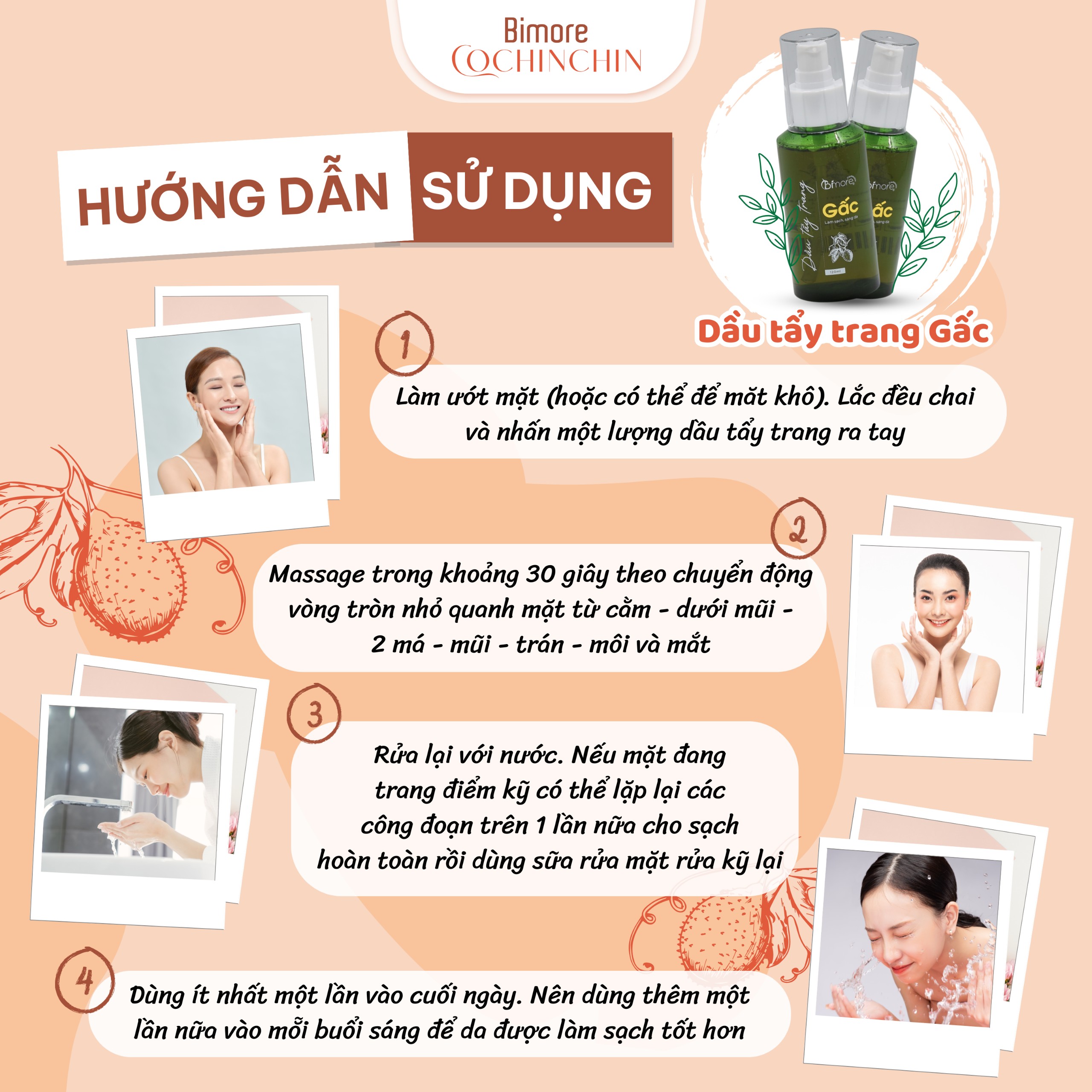 Mua tại TiktokDẦU TẨY TRANG GẤC BIMORE Số CB: 065/19/CBMP-LA Thành phần dầu tẩy trang Gấc BiMore: Oryza Sativa Bran Oil (Dầu cám gạo) Momordica Cochinchinensis Seed Aril Oil (Dầu gấc) Argania Spinosa Kernel Oil (Dầu argan) Sesamum Indicum Seed Oil (Dầu hạt mè) Vitis Vinifera Seed Oil (Dầu hạt nho) Sorbitan Sesquioleate (Nhũ hóa) Ricinus Communis Seed Oil (Dầu castor) Tocopheryl acetate (Vitamin E) Cymbopogon schoenanthus Oil td (Tinh dầu cỏ tranh) Hướng dẫn sử dụng dầu tẩy trang Gấc BiMore: