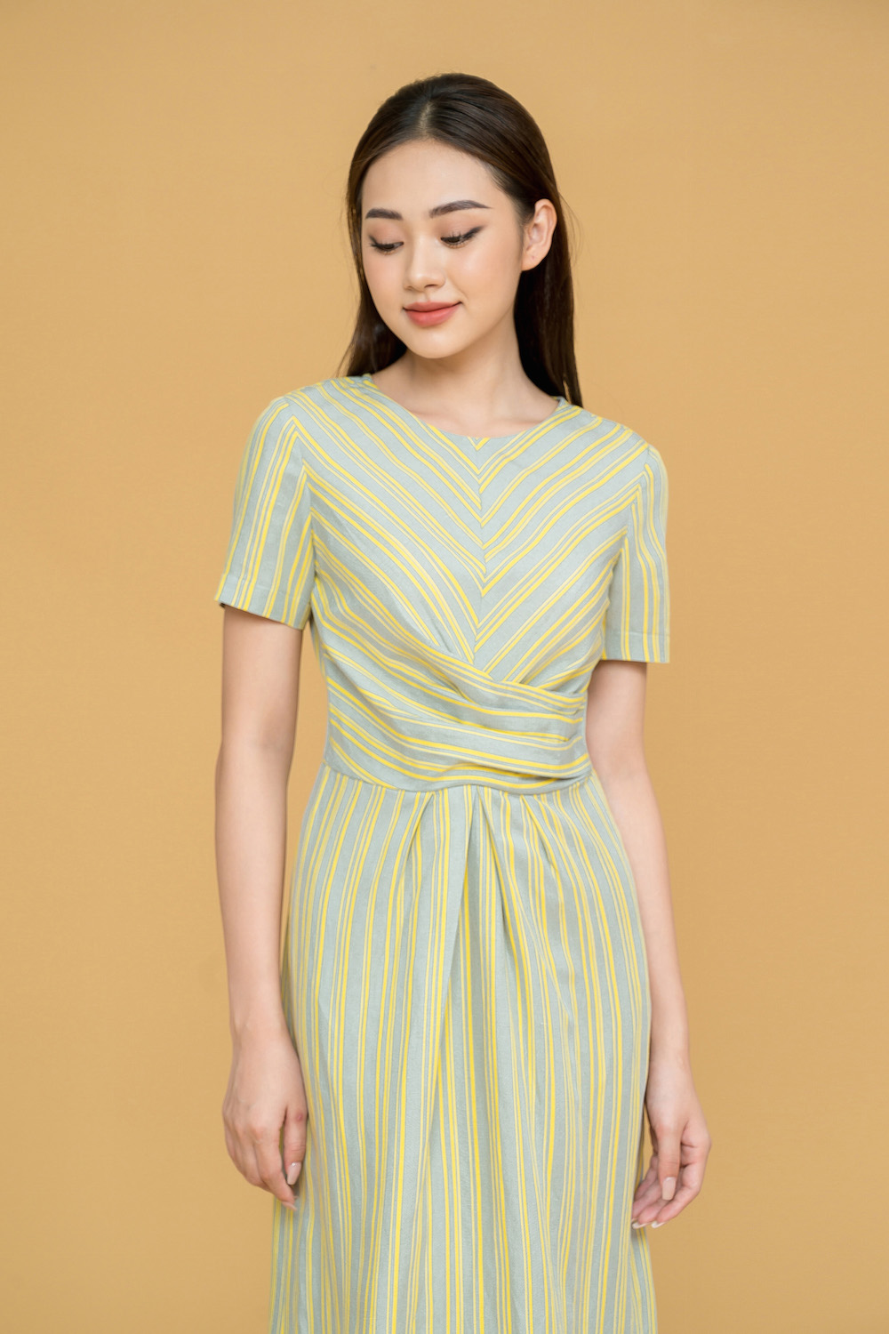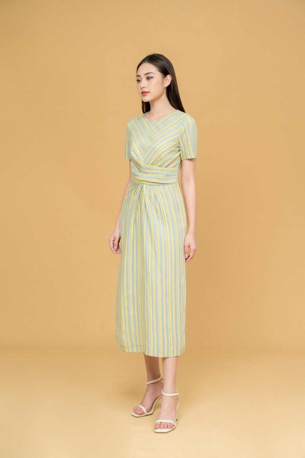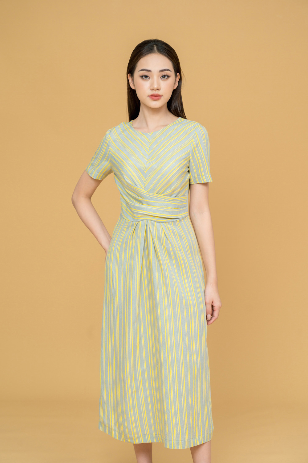 ✨De Leah - Đầm Xoắn Eo Xẻ Trước - Kẻ vàng