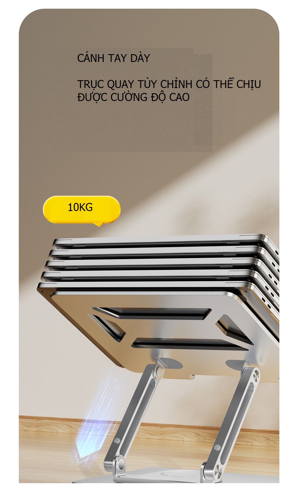 - Chất liệu hợp kim nhôm không gỉ, siêu vững, không gây kích ứng da - Thiết kế siêu mỏng, gọn, nhẹ, dán luôn ở mặt đáy của laptop, khi sử dụng chỉ cần gạt