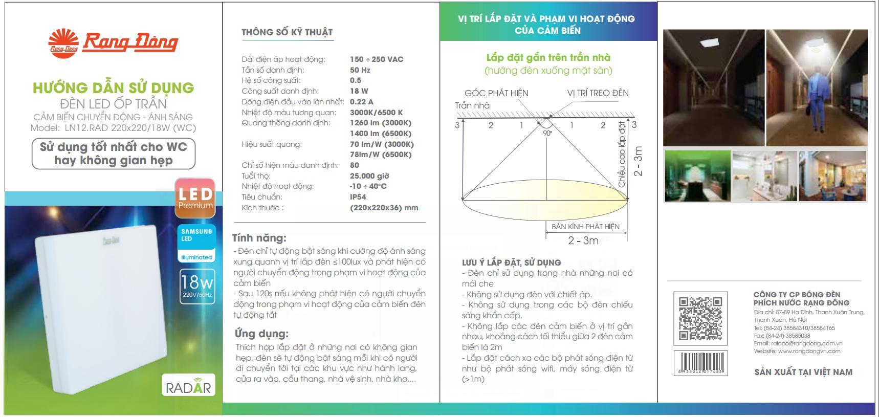 Mua tại TiktokĐèn LED ốp trần cảm biến chuyển động có tích hợp cảm biến ánh sáng dùng cho WC LN12 22X22 18W WC Công suất: 18 W Điện áp: 220V/50-60 Hz Nhiệt độ màu: 6500K Quang thông: 1260/1400 lm Kích thước (DxRxC): (220x220x36)mm Sử dụng cho chiếu sáng trong nhà Đèn tích hợp cảm biến ánh sáng và cảm biến Radar Khi ánh sáng môi trường ≤100lux và phá hiện có chuyển động trọng vùng hoạt động của cảm biến đèn tự động bật sáng. Sau 120s nếu không phát hiện chuyển động đèn tự động tắt