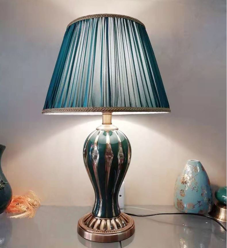 Chắc hẳn chúng ta đã quá quen thuộc với hình ảnh chiếc đèn bàn tạo điểm nhấn cho không gian phòng khách. Chúng còn là mẫu đèn trang trí được yêu thích nhất và cung cấp ánh sáng tốt cho những phút giây chúng ta thư giãn, nghỉ ngơi trong phòng ngủ. Phòng khách luôn được coi là bộ mặt của một căn nhà, vì vậy các vật dụng nhằm mục đích trang trí cũng được đầu tư kĩ lưỡng, tốn khá nhiều chi phí. Bên cạnh hệ thống chiếu sáng chính như đèn tuýp, đàn mâm, đèn âm trần,… chỉ với một chiếc đèn để bàn sẽ nâng tầm không gian. Bạn hãy đặt sản phẩm bên cạnh sofe, kệ tivi để hoàn thiện thêm vẻ đẹp tinh tế, sang trọng và đẳng cấp của căn phòng, cũng như toàn bộ ngôi nhà của gia đình. Thân đèn là bình gốm sứ cao cấp đã trải qua quá trình nung ở nhiệt độ cao đem đến chất lượng tuyệt hảo, trên đó được tô vẽ bằng những hoa văn, đường nét thật nhẹ nhàng nhưng cũng thật quyến rũ lòng người.  Kết hợp với chụp đèn màu xanh bằng vải lụa giúp chống thấm nước và đem đến ánh sáng êm dịu, ấm áp cho người sử dụng. Thiết kế không mang hoa văn sặc sỡ, không cầu kỳ rườm rà, màu sắc trang nhã thanh lịch thôi đã đủ làm nổi bật cả không gian. Đế đèn hợp kim được mạ lớp sơn tĩnh điện màu vàng Pháp không chỉ giúp sản phẩm tăng thêm vẻ sang trọng mà còn tạo độ bền cao hơn cho sản phẩm. Hãy đặt nó trong không gian phòng khách để tạo điểm nhấn sang trọng và ấm áp cho không gian. Hay như trên tủ đầu giường nơi phòng ngủ, sử dụng bóng đèn công suất nhỏ và ánh sáng vàng dịu nhẹ sẽ đem đến cảm giác thoải mái, thư thái từ đó nâng cao chất lượng giấc ngủ, cải thiện tinh thần. Ngoài ra, chúng có thể đặt trên bàn làm việc, bàn đọc sách trang hoàng không gian thềm ấn tượng. Cùng với đó là sử dụng bóng đèn ánh sáng trắng hoặc vàng có công suất lớn hơn trong phòng ngủ sẽ cung cấp nguồn ánh sáng cần thiết để làm việc, học tập có hiệu quả. Ngoài ra, bạn muốn tìm cho phòng ngủ yên tĩnh của ra đình mẫu đèn có ánh sáng êm dịu, thoải mái bên cạnh nguồn sáng chính. đèn bàn mang tới ánh sáng ổn định, ấm áp, dịu nhẹ, giúp chúng ta thêm ngon giấc. Do đó nhu cầu sử dụng đèn để bàn tròng phòng ngủ ngày càng tăng cao. Có thể coi đèn bàn trang trí là một trong những thiết bị chiếu sáng phù hợp trong rất nhiều không gian của gia đình. Với ánh sáng tập trung không chỉ làm nổi bật không gian xung quanh mà còn mang đến ánh sáng thích hợp cho việc học tập, nghỉ ngơi, làm việc.