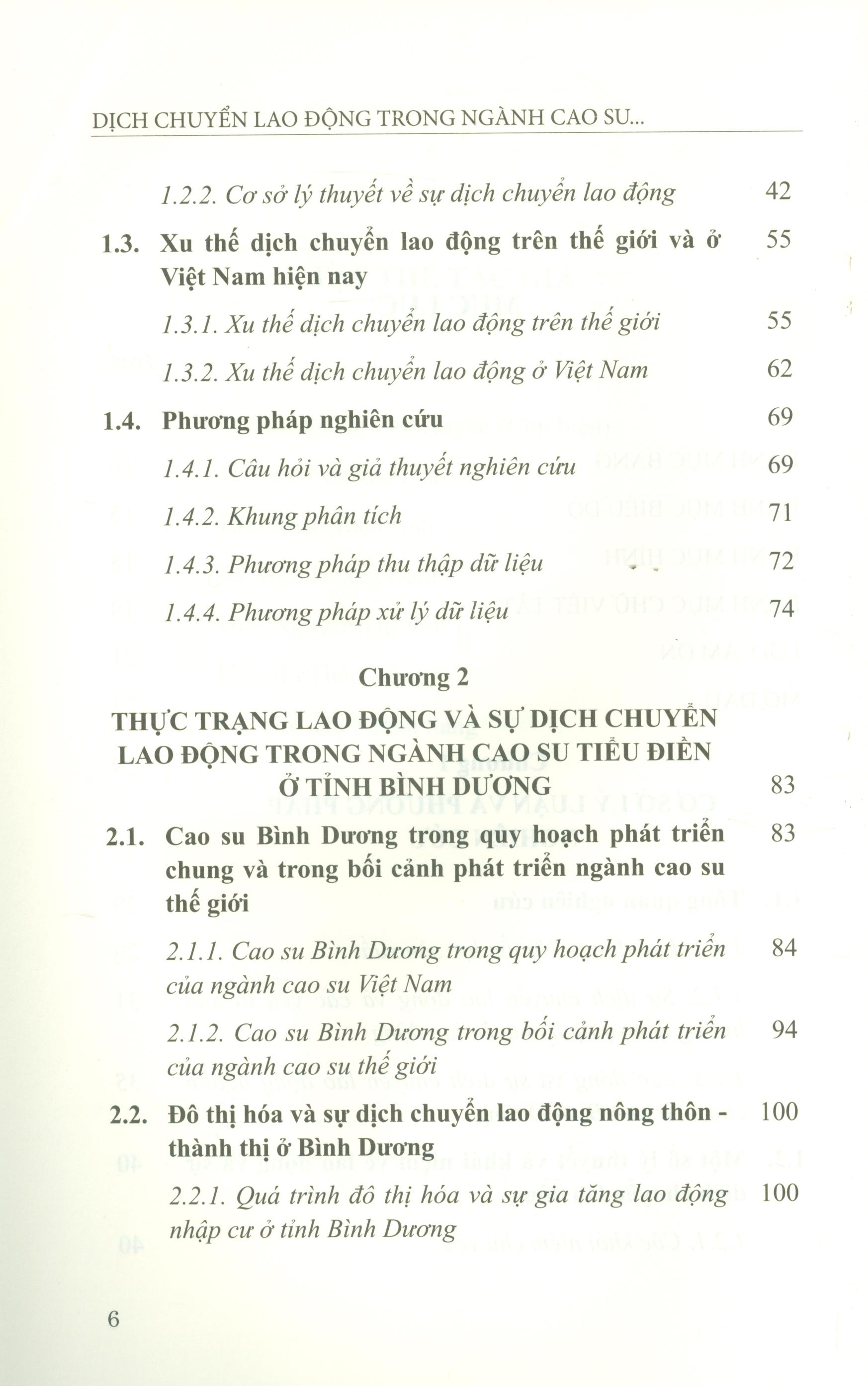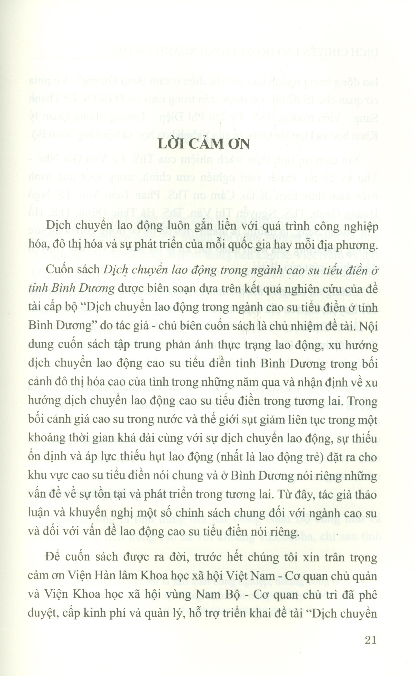 Dịch chuyển lao động luôn gắn liền với quá trình công nghiệp hóa, đô thị hóa và sự phát triển của mỗi quốc gia hay mỗi địa phương. Nội dung cuốn sách cho thấy cùng với tình trạng giá cao su sụt giảm liên tục trong thời gian qua thì sự dịch chuyển lao động đã gây ra tính thiếu ổn định và tạo áp lực thiếu hụt lao động (nhất là lao động trẻ) đối với ngành cao su tiểu điền. Điều này đặt ra cho khu vực cao su tiểu điền nói chung và Bình Dương nói riêng những vấn đề về sự tồn tại và phát triển trong tương lai. Đặc biệt, cuốn sách tập trung phản ánh thực trạng lao động, xu hướng dịch chuyển lao động cao su tiểu điền tại tỉnh Bình Dương trong bối cảnh đô thị hóa cao của tỉnh trong những năm qua và nhận định về xu hướng dịch chuyển lao động cao su tiểu điền trong tương lai. Từ đây, tác giả thảo luận những chính sách chung đối với ngành cao su, đồng thời khuyến nghị chính sách riêng đối với lao động cao su tiểu điền và đề xuất một số giải pháp quản trị lao động cao su tiểu điền.