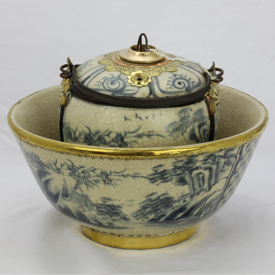 Điếu bát men rạn bọc đồng vẽ sơn thuỷ với hình dáng sang trọng