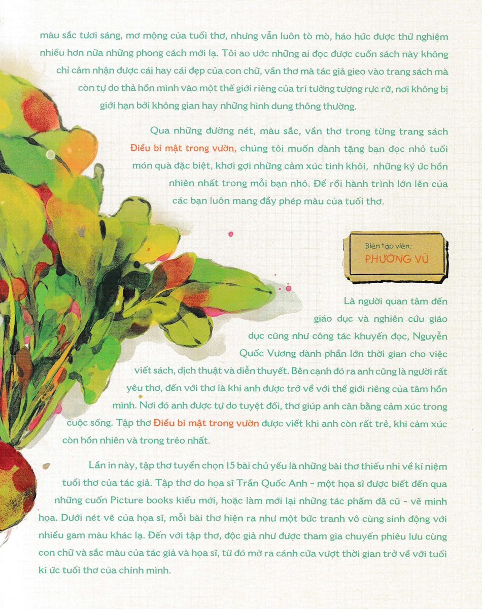 Qua những đường nét, màu sắc, vần thơ trong từng trang sách Điều Bí Mật Trong Vườn, chúng tôi muốn dành tặng bạn đọc nhỏ tuổi món quà đặc biệt, khơi gợi những cảm xúc tinh khôi, những ký ức hồn nhiên nhất trong mỗi bạn nhỏ. Để rồi hành trình lớn lên của các bạn luôn mang đầy phép màu của tuổi thơ.