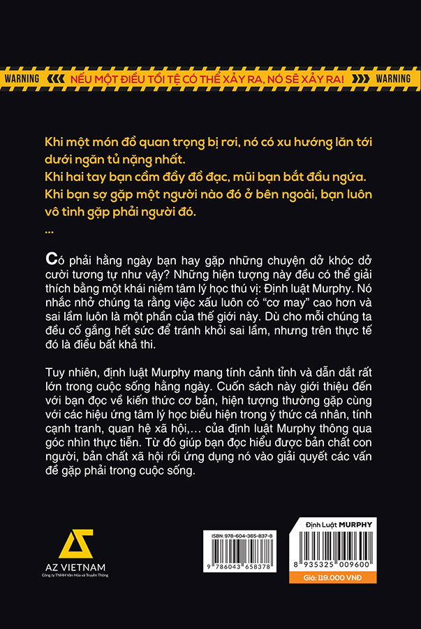 Tuy nhiên, định luật Murphy mang tính cảnh tỉnh và dẫn dắt rất lớn trong cuộc sống hằng ngày. Cuốn sách này giới thiệu đến với bạn đọc về kiến thức cơ bản, hiện tượng thường gặp cùng với các hiệu ứng tâm lý học biểu hiện trong ý thức cá nhân, tính cạnh tranh, quan hệ xã hội,… của định luật Murphy thông qua góc nhìn thực tiễn. Từ đó giúp bạn đọc hiểu được bản chất con người, bản chất xã hội rồi ứng dụng nó vào giải quyết các vấn đề gặp phải trong cuộc sống.
