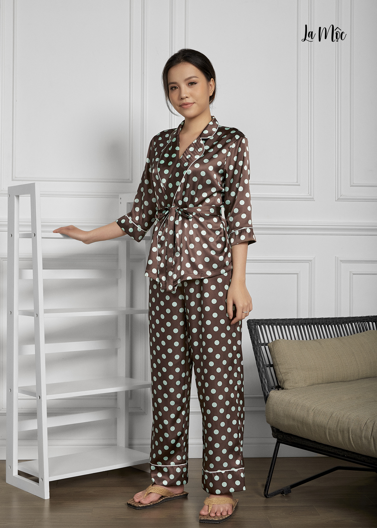 Pyjama mặc nhà màu nâu họa tiết chấm bi xanh - LA MỘC chất liệu vải SATIN LỤA.