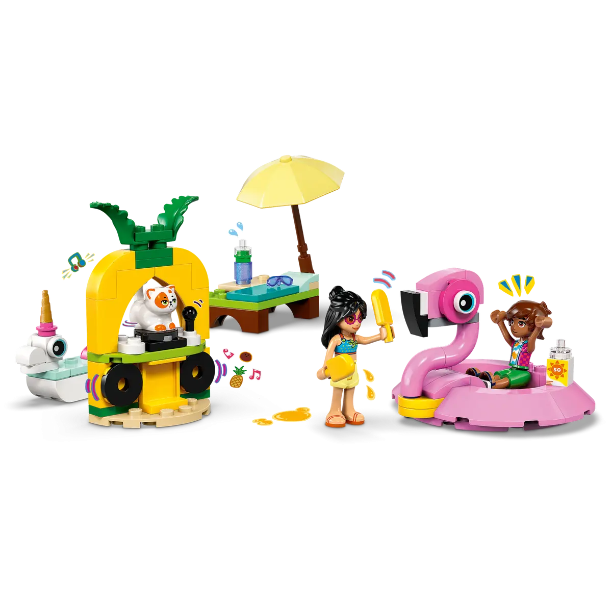 - Một ngày hè lý tưởng bắt đầu với chiếc phao hồng hạc cực “cool” và phao kỳ lân ngộ nghĩnh. Liann và Leo tận hưởng không khí thư giãn cùng que kem mát lạnh, trong khi chú mèo Churro nghịch ngợm nằm trên phao kỳ lân. Sau đó, cả nhóm đến gian hàng DJ hình trái dứa để chơi nhạc, nhún nhảy, rồi ngồi nghỉ ngơi với đồ uống mát lạnh trên ghế dài. Một buổi tiệc hồ bơi tuyệt vời đang chờ bé khám phá!