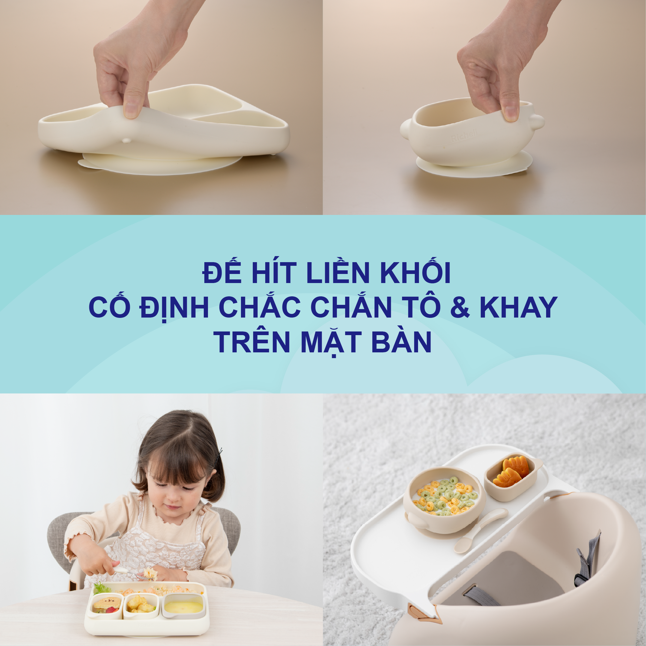 Đế hít liền khối thông minh giúp cố định chắc chắn khay và tô trên mặt bàn, hạn chế tình trạng rơi đổ khi bé ăn. Giải pháp lý tưởng giúp bố mẹ an tâm trong quá trình cho bé ăn dặm, đặc biệt khi bé bắt đầu tập ăn một cách chủ động và tự lập.