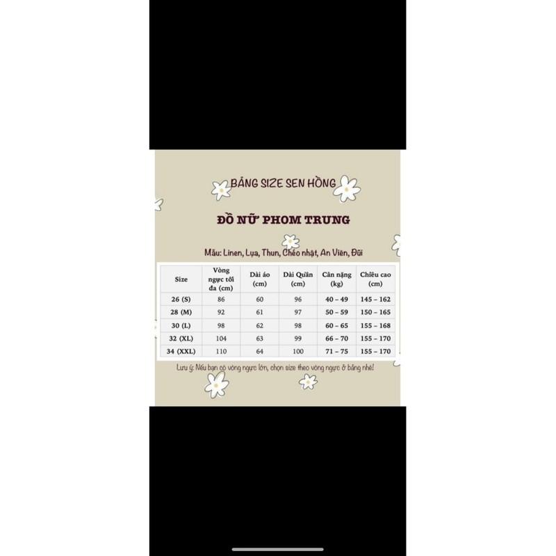 HƯỚNG DẪN CHỌN SIZE BỘ ĐỒ LAM ĐI CHÙA Size 24: 1m49 - 1m59. 36 - 45kg. Vòng ngực của áo 78cm Size 26: 1m53 - 1m62 , 45 - 50kg , 81cm Size 28: 1m55 - 1m65. 50 - 55kg. 88cm Size 30: 1m57 - 1m68. 56 - 59kg. 89cm Size 32: 1m60 - 1m70. 60 - 63kg.95cm Size 34: 1m60 - 1m70 63-67kg. 96cm