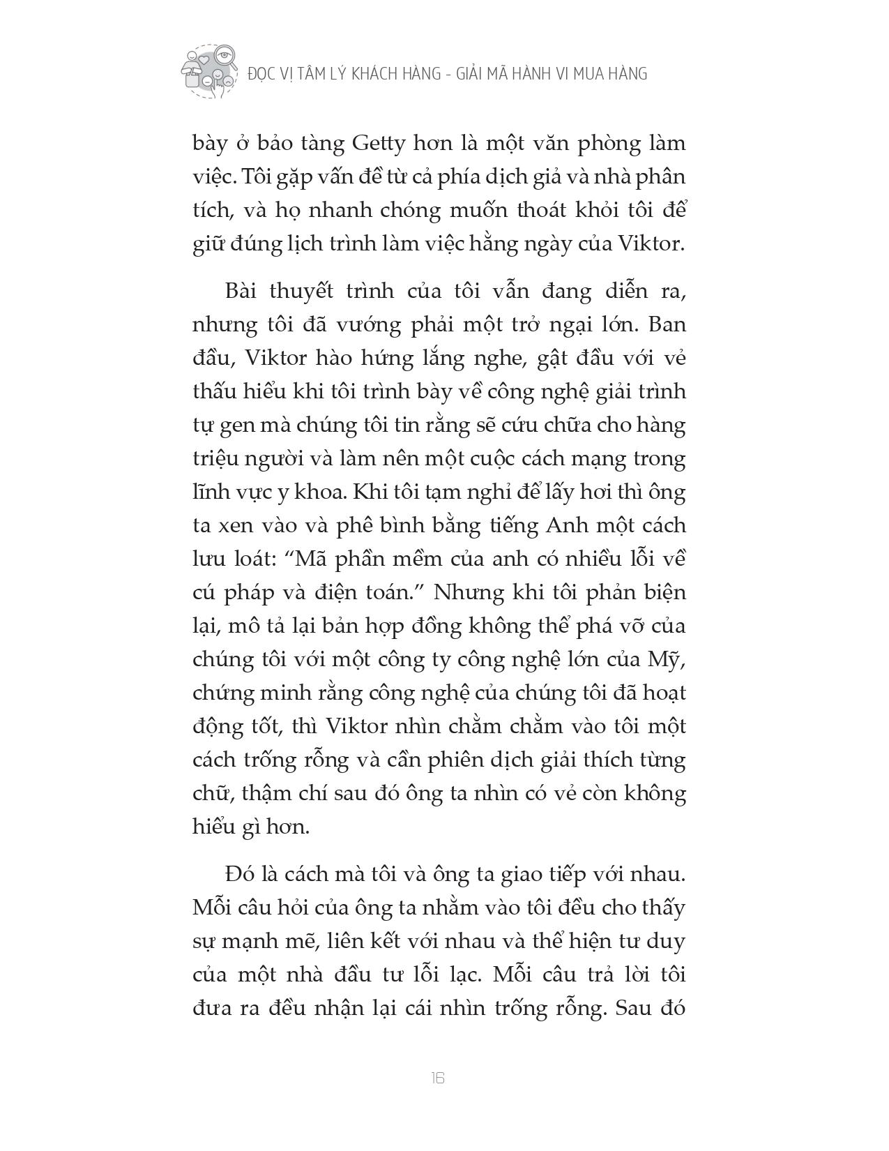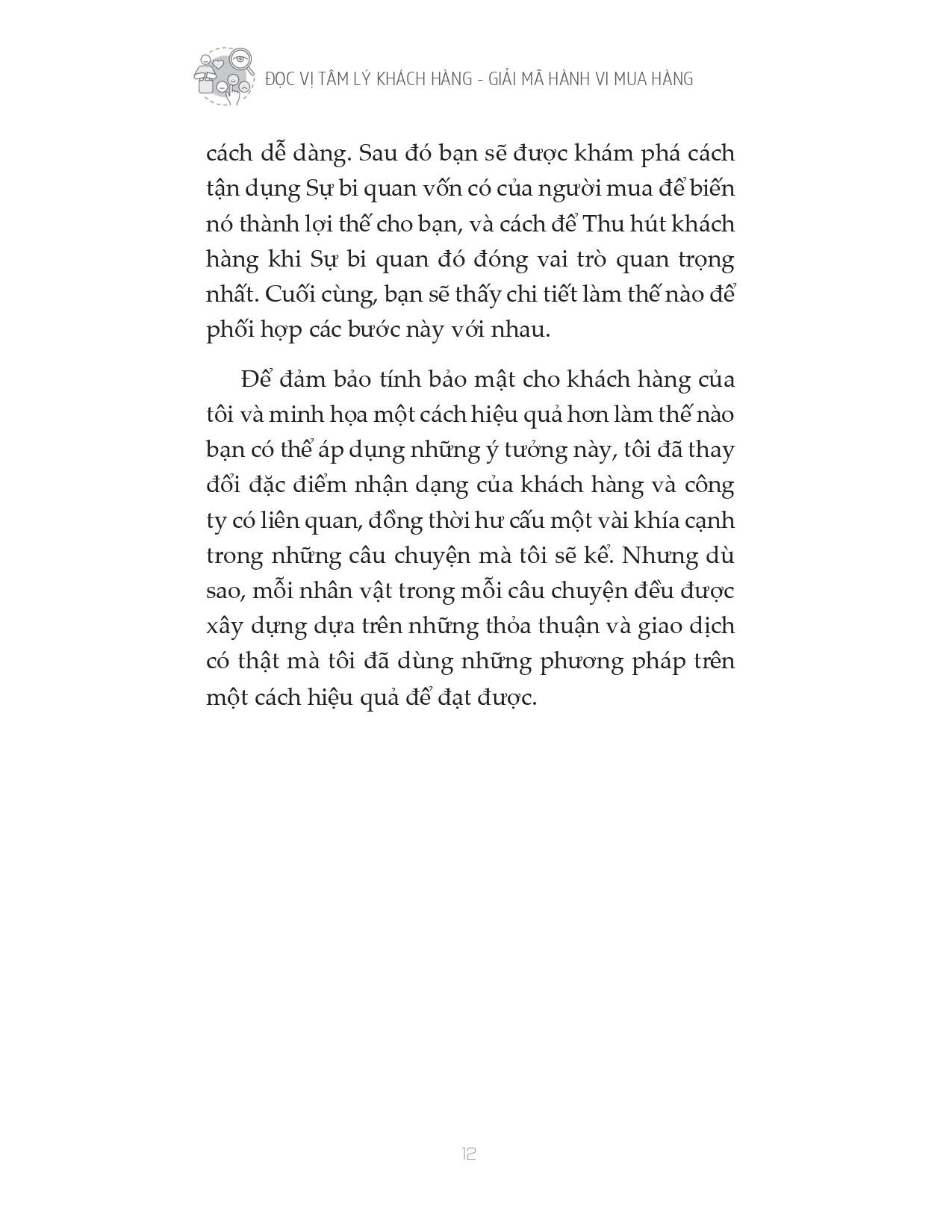 Cuốn sách “Đọc vị tâm lý khách hàng - Giải mã hành vi mua hàng” cung cấp cho bạn phương pháp bán hàng hoàn toàn mới, không chèo kéo, không gây áp lực, giúp bạn có thể bán bất kỳ thứ gì cho bất kỳ ai. Trọng tâm của cuốn sách nằm ở phương pháp gieo một ý tưởng vào tâm trí người khác, biến ý tưởng của bạn thành của người mua. Tác giả Oren hướng dẫn bạn những quy tắc “bí quyết kinh doanh” - để làm được điều đó cũng như các bước để chinh phục mục tiêu của bạn mà không cần gây áp lực lên họ. Cuốn sách này chính là chìa khóa giúp bạn “lật ngược thế cờ”, một “game changer” thực sự.
