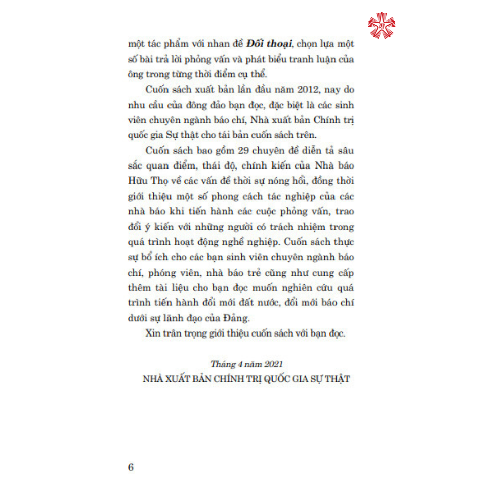 Nhà xuất bản chính trị Quốc gia Sự thật xin giới thiệu cuốn sách ”Đối thoại” của nhà báo Hữu thọ