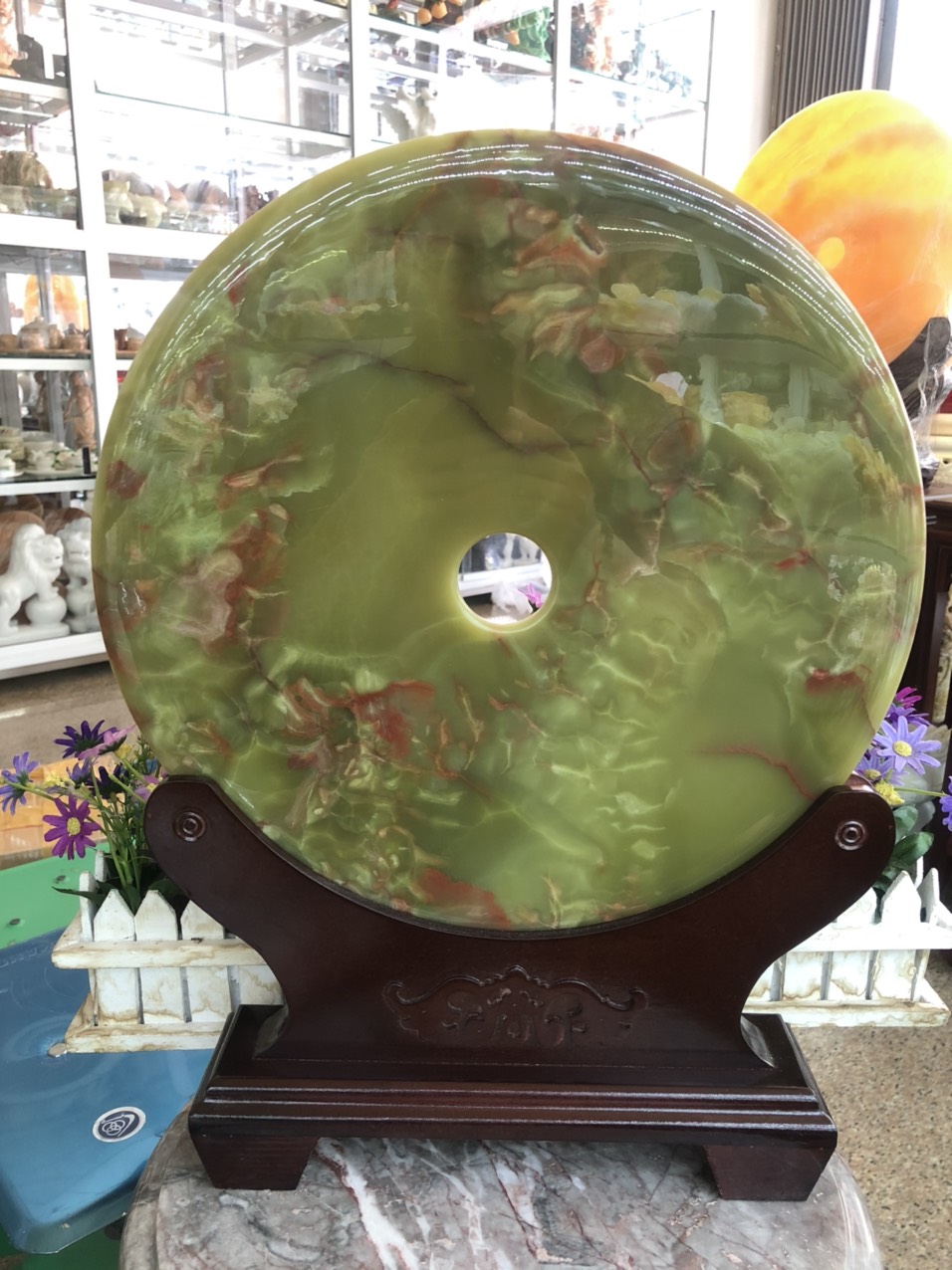 Chất liệu: Đá ngọc Onyx Kích thước: Đường kính 26 cm Khối lượng: 2,7 kg Từ thời xưa xưa, tiền xu được sử dụng với hình dạng tròn tượng trưng cho trời, giữa là hình