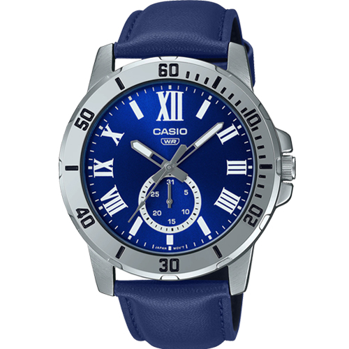 Đồng hồ Casio MTP-VD200BL-5BUDF thuộc Casio nam với dây da, nhiều kim, chống nước, mặt số la mã.