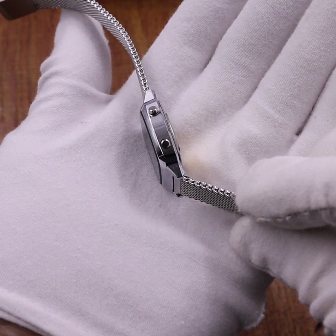 Thời trang cho phái đẹp với mẫu dây lưới Casio LA670WEM-7DF được phối tông màu bạc trẻ trung cùng với thiết kế bộ máy nhỏ gọn thanh mảnh với nền mặt số điện tử hiện