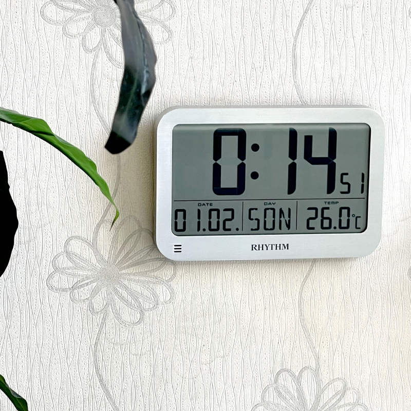 Đồng hồ điện tử Rhythm LCT084NR19, sử dụng 3 pin AA. Vỏ nhựa cao cấp sơn nhũ bạc, kích thước 22.4 x 15.0 x 1,8cm nặng 320g. Màn hình điện tử hiển thị lịch ngày