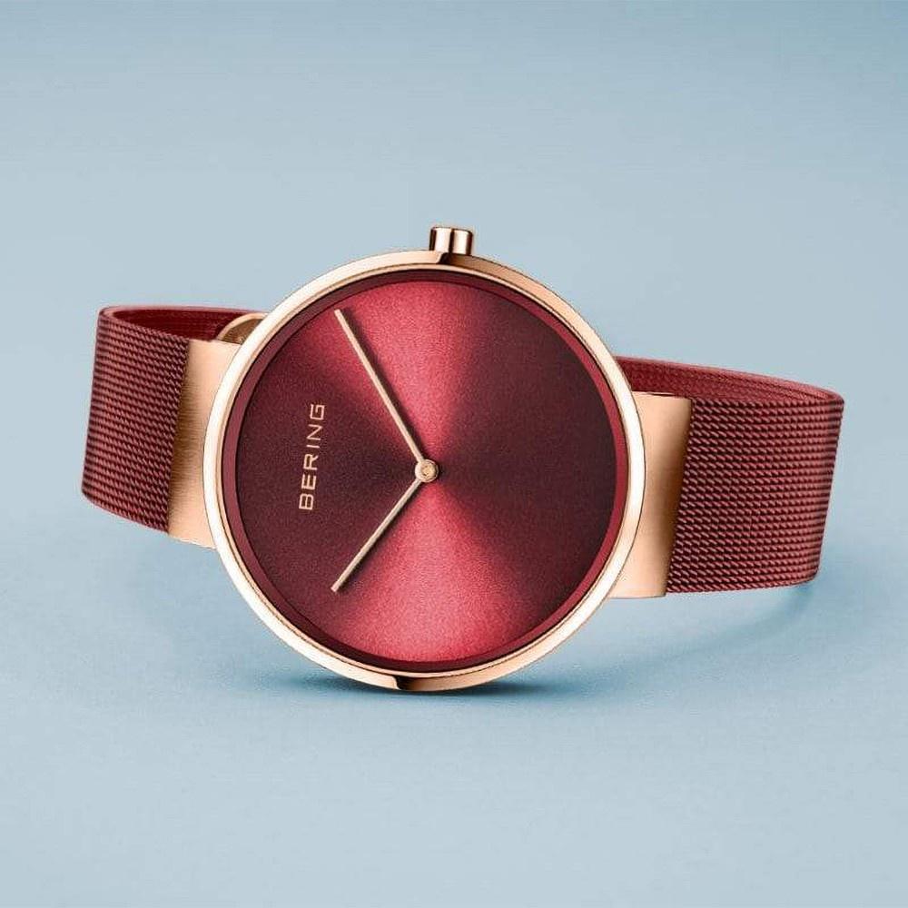 Cổ điển, phá cách và thú vị. Phong cách hoàn hảo kết hợp với chủ nghĩa tối giản đương đại. Lấy cảm hứng từ thiết kế Đan Mạch, CLASSIC COLLECTION đại diện cho một chiếc đồng hồ độc đáo, làm nổi bật hoàn hảo phong cách hàng ngày của bạn. Vỏ máy bằng thép không gỉ màu vàng hồng được chải mịn, được làm bằng thép không gỉ y tế (316L) nguyên chất, chất lượng cao, kết hợp với dây đeo Milanese hiện đại màu đỏ, mang đến vẻ ngoài BERING cổ điển. Dây đeo Milanese được chế tạo với thợ tay nghề cao mang đến cho chiếc đồng hồ một nét tinh tế, gần như cao quý. Mặt đồng hồ tối giản phù hợp với dây đeo, được bảo vệ bằng tinh thể sapphire trong suốt, chống xước giúp làm hoàn thiện vẻ ngoài cổ điển một cách hoàn hảo.