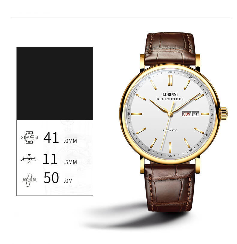 Nhãn hiệu LOBINNI Mã sản phẩm No.16053-9 Giới tính Nam Kiểu máy Automatic (Máy Cơ) Đường kính mặt 43 mm Độ dày 11,5 mm Chất liệu vỏ Thép không gỉ 316L Chất liệu dây Dây da cao cấp Chất liệu mặt kính Sapphire Crystal